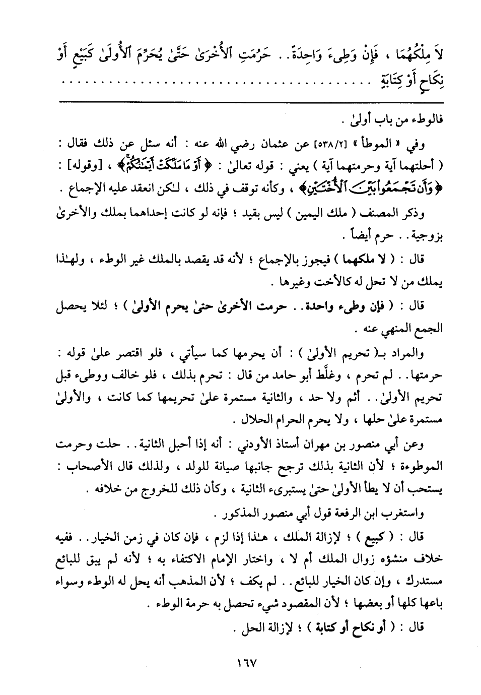 وفي (الموطأ) عن عثمان رضي الله عنه: أنه سئل عن ذلك فقال: (أحلتهما آية وحرمتهما آية) يعني: قوله تعالى: {لَوْ مَا مَلَكَتْ أَيْمَنُكُمْ}، (قوله): {وَأَن تَجْمَعُوا بَيْنَ الأُخْتَيْنِ}، وكأنه توقف في ذلك، لكن انعقد عليه الإجماع.