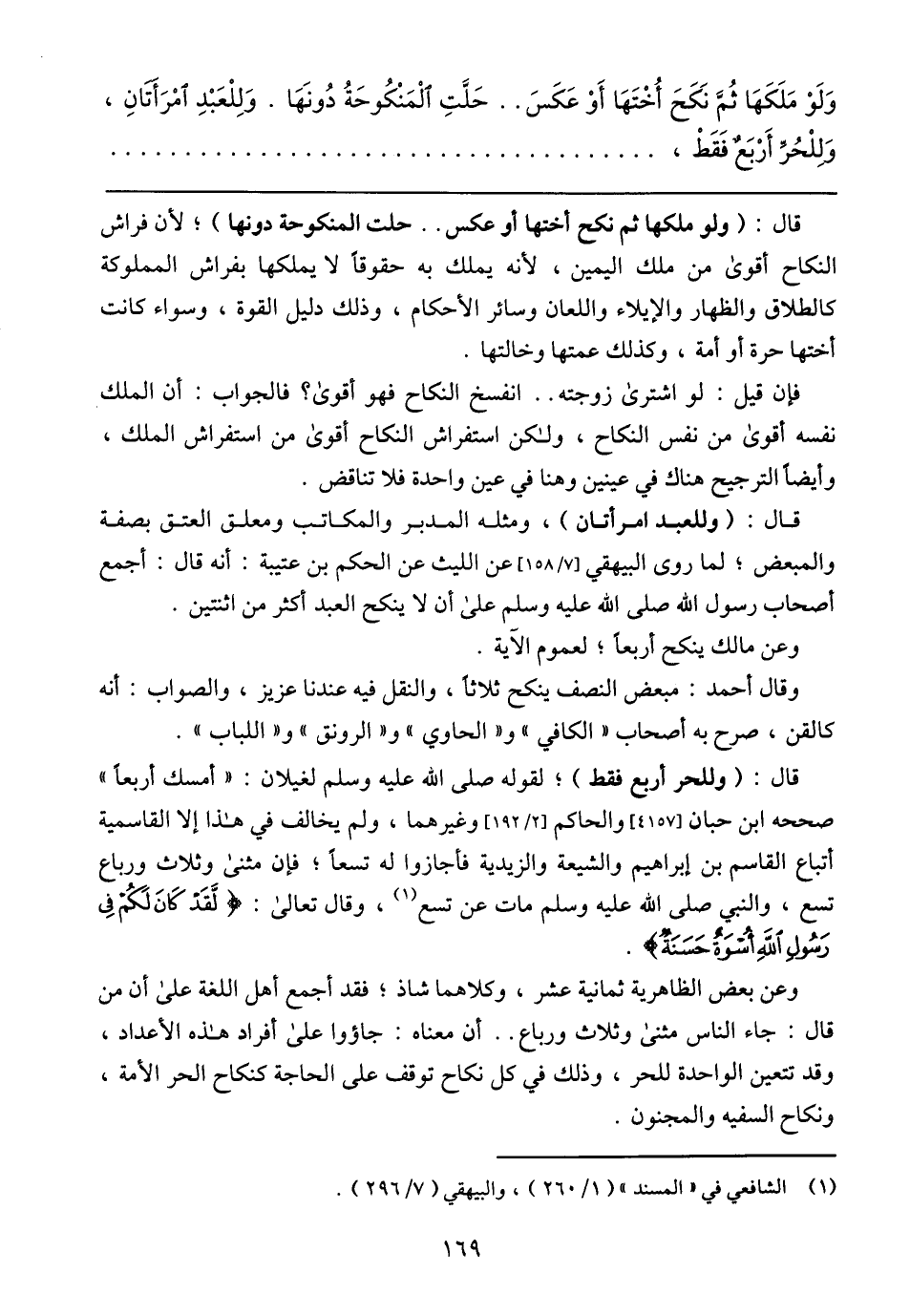وَلَوْ مَلَكَهَا ثُمَّ نَكَحَ أُخْتَهَا أوْ عَكَسَ .. حَلَّتِ الْمَنْكُوحَةُ دُونَهَا. وَلِلْعَبْدِ امْرَأَتَانِ، وِلِلْحُرِّ أَرْبَعٌ فَقَطْ،
