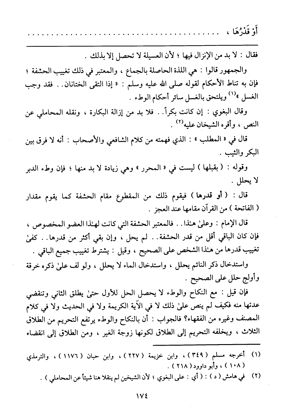 فإن قيل: مع النكاح والوطء لا يحصل الحل للأول حتى يطلق الثاني وتنقضي عدتها منه فكيف لم ينص على ذلك لا في الآية الكريمة ولا في الحديث ولا في كلام المصنف وغيره من الفقهاء؟ فالجواب: أن بالنكاح والوطء يرتفع التحريم من الطلاق الثلاث، ويخلفه التحريم إلى الطلاق لكونها زوجة الغير، ومن الطلاق إلى انقضاء