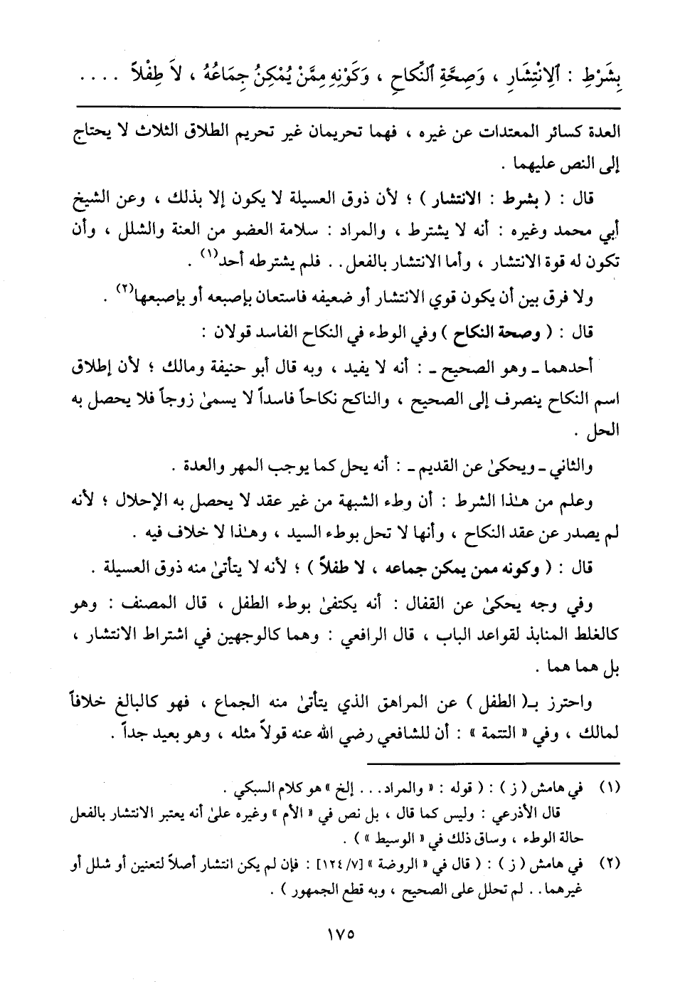 بِشَرْطِ: الاِنْتِشِارِ، وَصِحَّةِ الْنِكَاحِ، وَكَوْنِهِ مِمَّنْ يُمْكِنُ جِمَاعُهُ، لاَ طِفْلاً