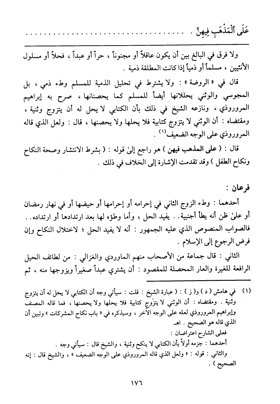 قال في (الروضة): ولا يشترط في تحليل الذمية للمسلم وطء ذمي، بل المجوسي والوثني يحللانها أيضًا للمسلم كما يحصنانها، صرح به إبراهيم المروروذي، ونازعه الشيخ في ذلك بأن الكتابي لا يحل له أن يتزوج وثنية، ومقتضاه: أن الوثني لا يتزوج كتابية فلا يحلها ولا يحصنها، قال: ولعل الذي قاله المروروذي على الوجه الضعيف.
