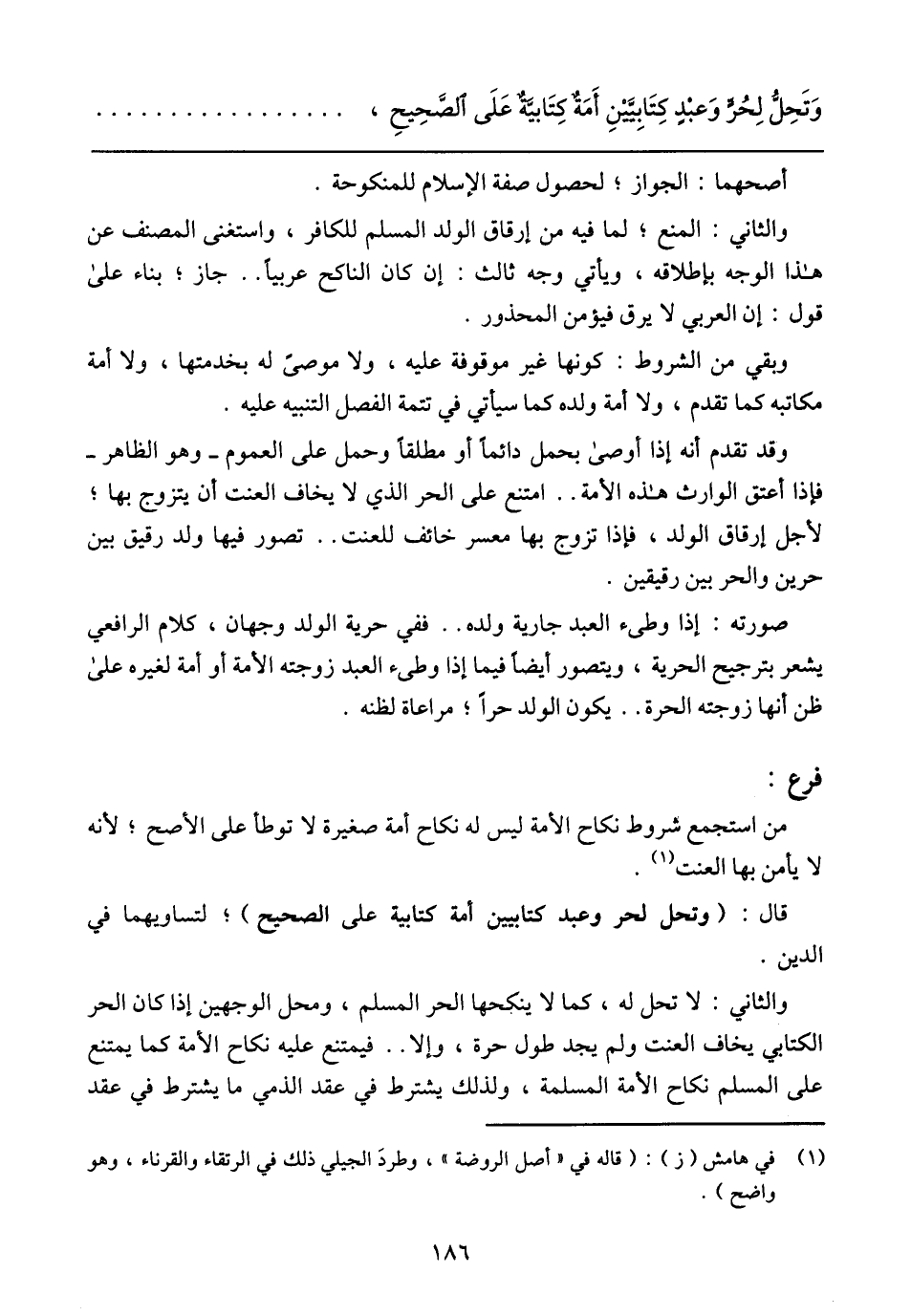 والثاني: لا تحل له، كما لا ينكحها الحر المسلم، ومحل الوجهين إذا كان الحر الكتابي يخاف العنت ولم يجد طول حرة، وإلا .. فيمتنع عليه نكاح الأمة كما يمتنع على المسلم نكاح الأمة المسلمة، ولذلك يشترط في عقد الذمي ما يشترط في عقد