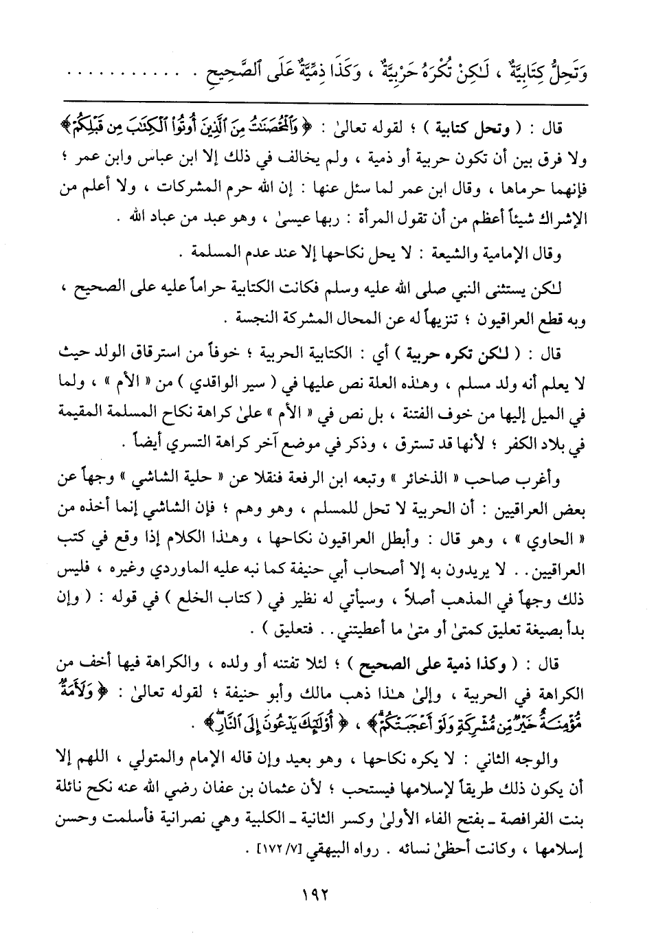 قال: (وتحل كتابية)؛ لقوله تعالى: {وَالْمُحْصَنَتُ مِنَ الَّذِينَ أُوتُوا الْكِتَبَ مِنْ قَبْلِكُمْ} ولا فرق بين أن تكون حربية أو ذمية، ولم يخالف في ذلك إلا ابن عباس وابن عمر؛ فإنهما حرماها، وقال ابن عمر لما سئل عنها: إن الله حرم المشركات، ولا أعلم من الإشراك شيئًا أعظم من أن تقول المرأة: ربها عيسى، وهو عبد من عباد الله.