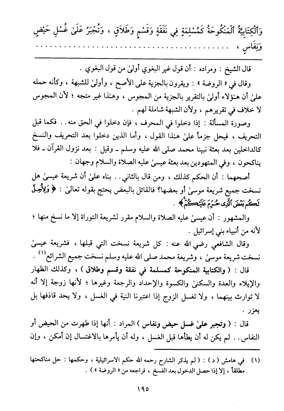 وَالْكِتَابِيَّةُ الْمَنْكُوحَةُ كَمُسْلِمَةٍ فِي نَفَقَةٍ وَقَسْمٍ وَطَلاَقٍ، وَتُجْبَرُ عَلَى غُسْلِ حَيْضٍ وَنِفَاسٍ،