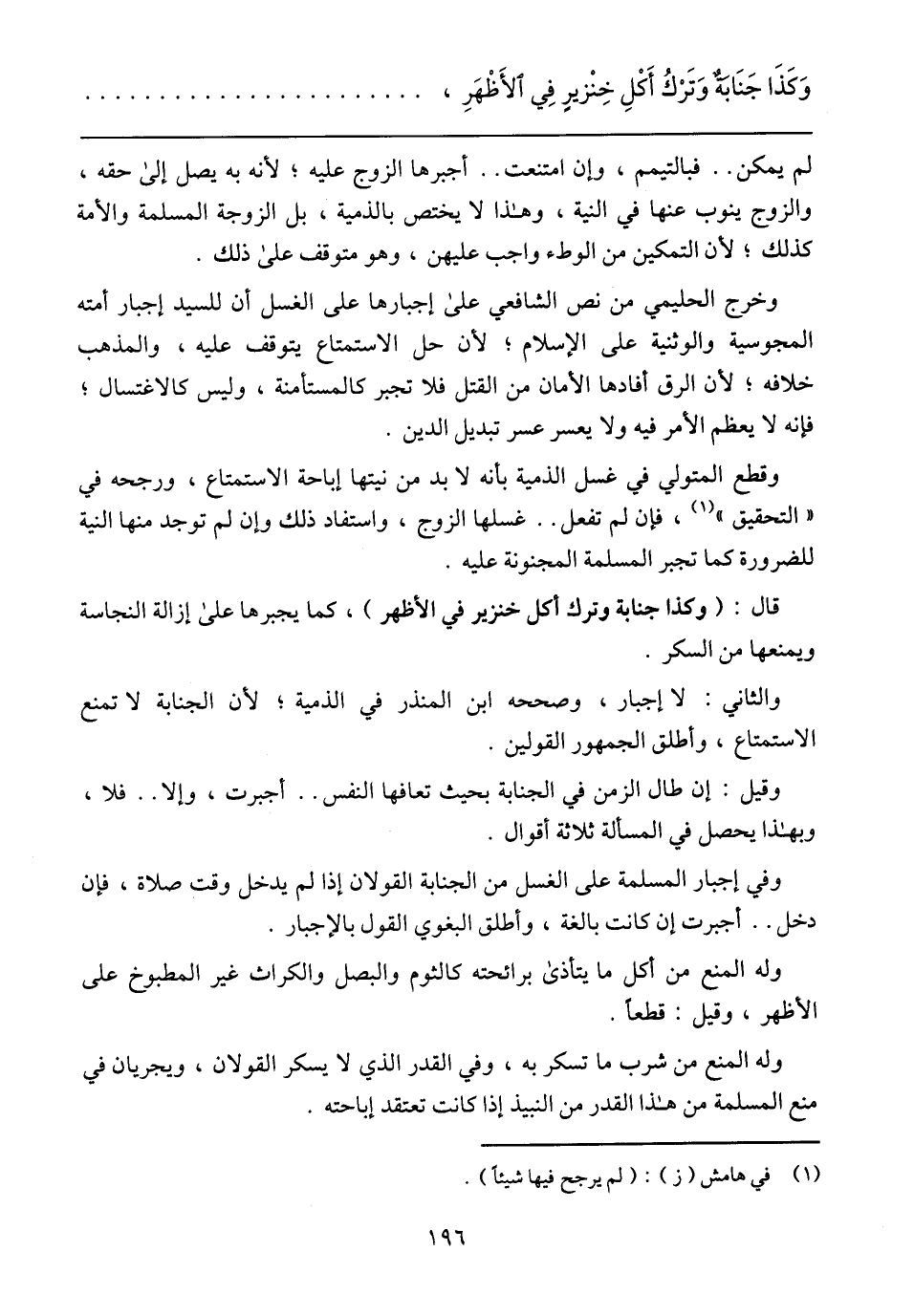 والثاني: لا إجبار، وصححه ابن المنذر في الذمية؛ لأن الجنابة لا تمنع الاستمتاع، وأطلق الجمهور القولين.