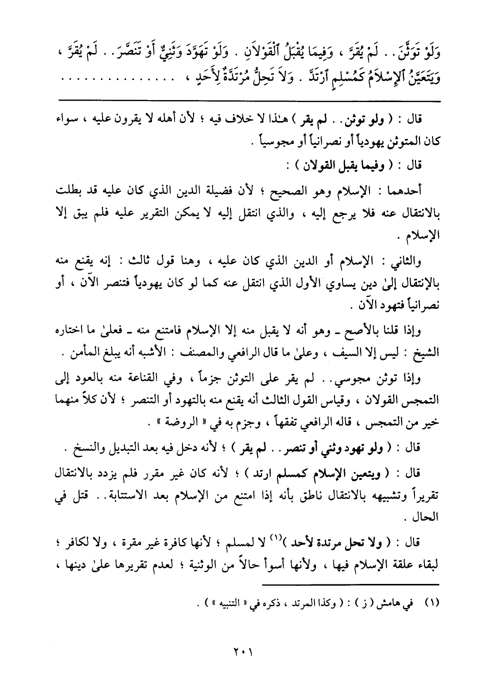 وإذا توثن مجوسي .. لم يقر على التوثن جزمًا، وفي القناعة منه بالعود إلى التمجس القولان، وقياس القول الثالث أنه يقنع منه بالتهود أو التنصر؛ لأن كلاً منهما خير من التمجس، قاله الرافعي تفقهًا، وجزم به في (الروضة).
