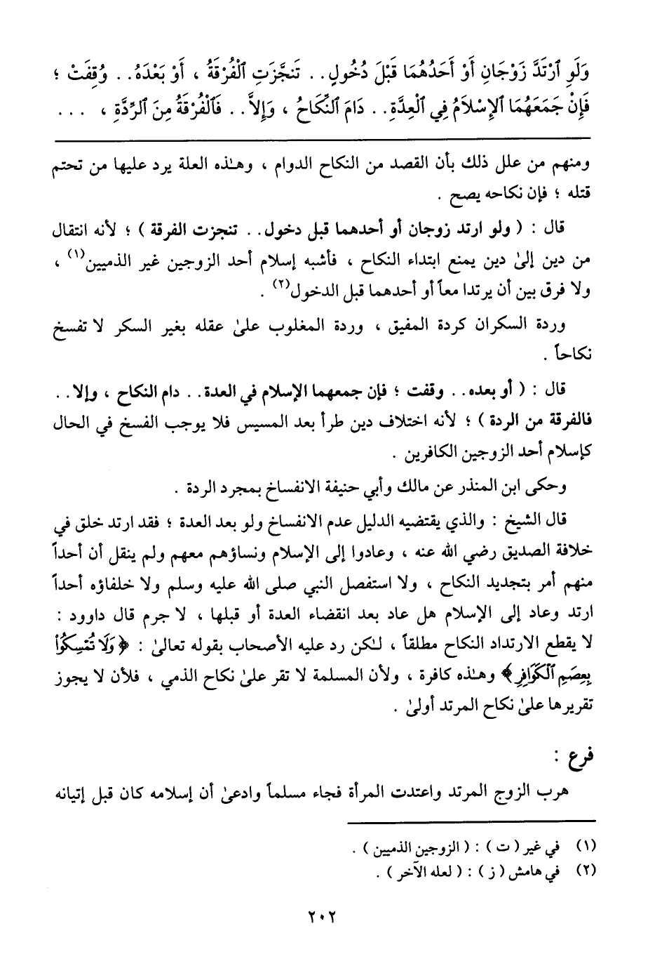 وَلَوِ ارْتَدَّ زَوْجَانِ أَوْ أَحَدُهُمَا قَبْلَ دُخُولٍ .. تَنجَّزَتِ الْفُرْقَةُ، أَوْ بَعْدَهُ .. وُقِفَتْ؛ فَإِنْ جَمَعَهُمَا الإِسْلاَمُ فِي الْعِدَّةِ .. دَامَ النِّكَاحُ، وَإِلاَّ .. فَالْفُرْقَةُ مِنَ الرِّدَّةِ،