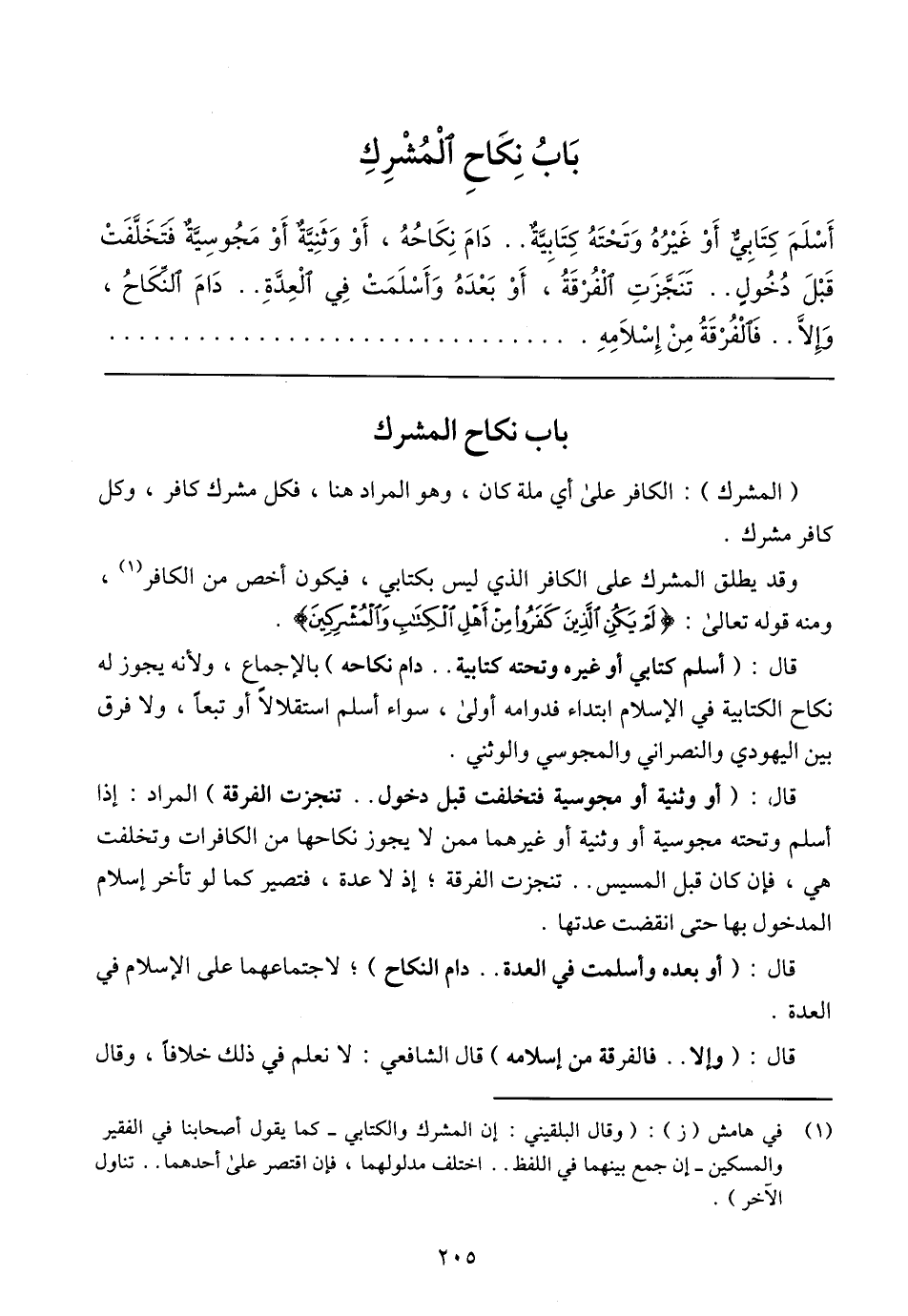أَسْلَمَ كِتَابِيٌّ أَوْ غَيْرُهُ وَتَحْتَهُ كِتَابِيَّةٌ .. دَامَ نِكَاحُهُ، أَوْ وَثَنِيَّةٌ أَوْ مَجُوسِيَّةٌ فَتَخَلَّفَتْ قَبْلَ دُخُولٍ .. تَنَجَّزَتِ الْفُرْقَةُ، أَوْ بَعْدَهُ وَأَسْلَمَتْ فِي الْعِدَّةِ .. دَامَ النِّكَاحُ، وَإِلاَّ .. فَالْفُرْقَةُ مِنْ إِسْلاَمِهِ