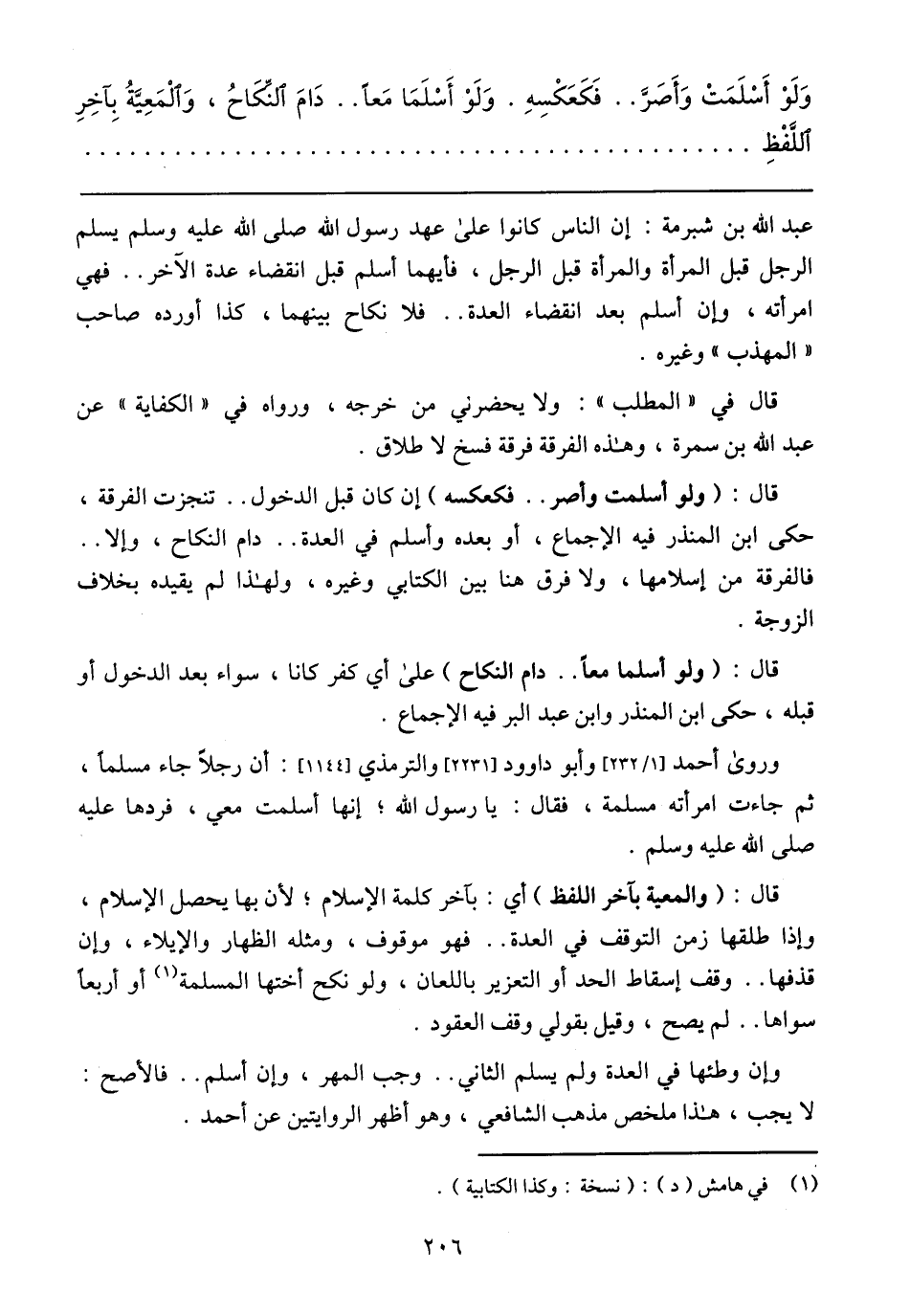 عبد الله بن شبرمة: إن الناس كانوا على عهد رسول الله صلى الله عليه وسلم يسلم الرجل قبل المرأة والمرأة قبل الرجل، فأيهما أسلم قبل انقضاء عدة الآخر .. فهي امرأته، وإن أسلم بعد انقضاء العدة .. فلا نكاح بينهما، كذا أورده صاحب (المهذب) وغيره.