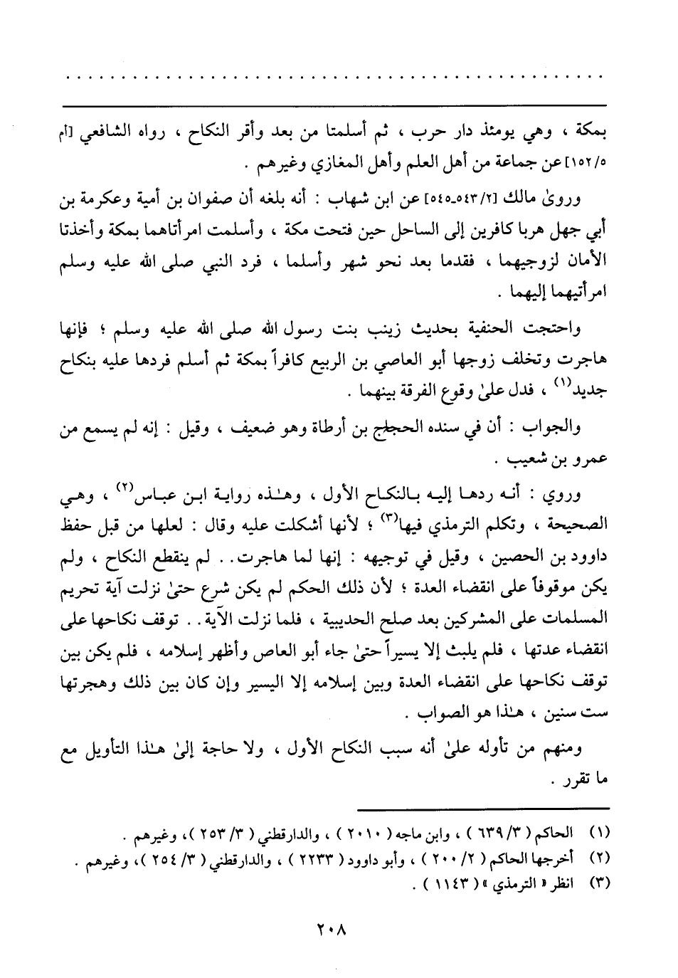 واحتجت الحنفية بحديث زينب بنت رسول الله صلى الله عليه وسلم؛ فإنها هاجرت وتخلف زوجها أبو العاصي بن الربيع كافرًا بمكة ثم أسلم فردها عليه بنكاح جديد، فدل على وقوع الفرقة بينهما.