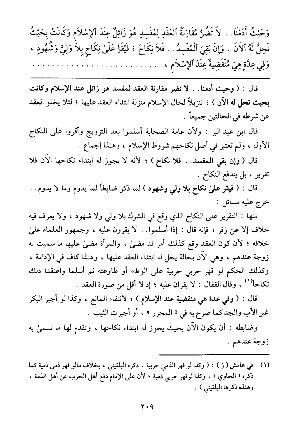وَحَيْثُ أَدَمْنَا .. لاَ تَضُرُّ مُقَارَنَةُ الْعَقْدِ لِمُفْسِدٍ هُوَ زَائِلٌ عِنْدَ الإِسْلاَمِ وَكَانَتْ بِحَيْثُ تَحِلُّ لَهُ الآنَ. وَإِنْ بَقِيَ الْمُفْسِدُ .. فَلاَ نِكَاحَ؛ فَيُقَرُّ عَلَى نِكَاحٍ بِلاَ وَلِيٍّ وَشُهُودٍ، وَفِي عِدَّةٍ هِيَ مُنْقَضِيةٌ عِنْدَ الإِسْلاَمِ،