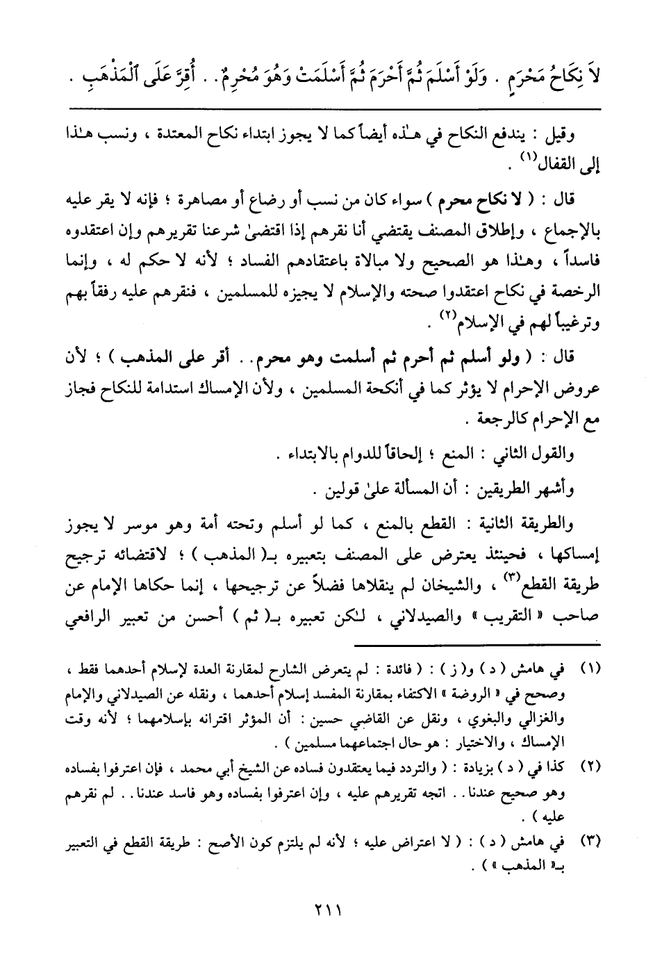 قال: (لا نكاح محرم) سواء كان من نسب أو رضاع أو مصاهرة؛ فإنه لا يقر عليه بالإجماع، وإطلاق المصنف يقتضي أنا نقرهم إذا اقتضى شرعنا تقريرهم وإن اعتقدوه فاسدًا، وهذا هو الصحيح ولا مبالاة باعتقادهم الفساد؛ لأنه لا حكم له، وإنما الرخصة في نكاح اعتقدوا صحته والإسلام لا يجيزه للمسلمين، فنقرهم عليه رفقًا بهم وترغيبًا لهم في الإسلام.