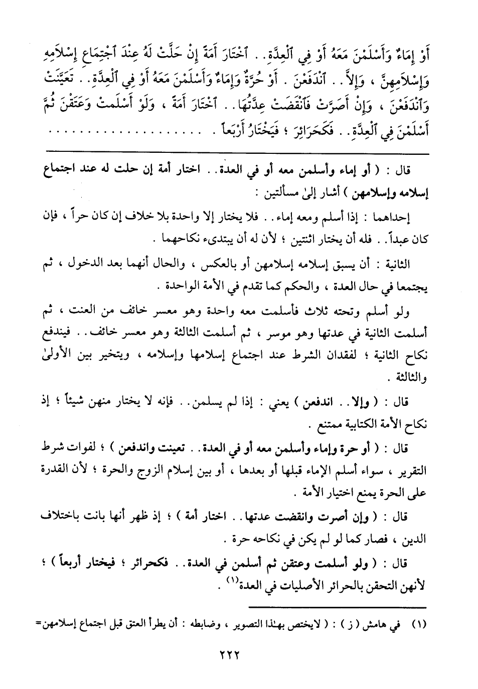 أَوْ إِمَاءٌ وَأَسْلَمْنَ مَعَهُ أَوْ فِي الْعِدَّةِ .. اخْتَارَ أَمَةً إِنْ حَلَّتْ لَهُ اجْتِمَاعِ إِسْلاَمِهِ وَإِسْلاَمِهِنَّ، وَإِلاَّ .. انْدَفَعْنَ. أَوْ حُرَّةٌ وَإِمَاءٌ وَأَسْلَمْنَ مَعَهُ أَوْ فِي الْعِدَّةِ .. تَعَيَّنَتْ وَانْدَفَعْنَ، وَإِنْ أَصَرَّتْ فَأنْقَضَتْ عِدَّتُهَا .. اخْتَارَ أَمَةً، وَلَوْ أَسْلَمتْ وَعَتَقْنَ ثُمَّ أَسْلَمْنَ فِي الْعِدَّةِ .. فَكَحَرَائِرَ؛ فَيَخْتَارُ أَرْبَعًا