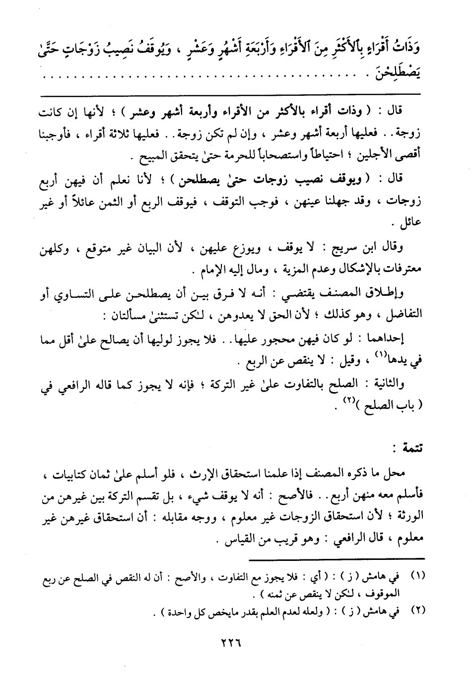 وَذَاتُ أَقْرَاءٍ بِالأَكْثَرِ مِنَ الأَقْرَاءِ وَأَرْبَعَةِ أَشْهُرٍ وَعَشْرٍ، وَيُوقَفُ نَصِيبُ زَوْجَاتٍ حَتَّى يَصْطَلِحْنَ