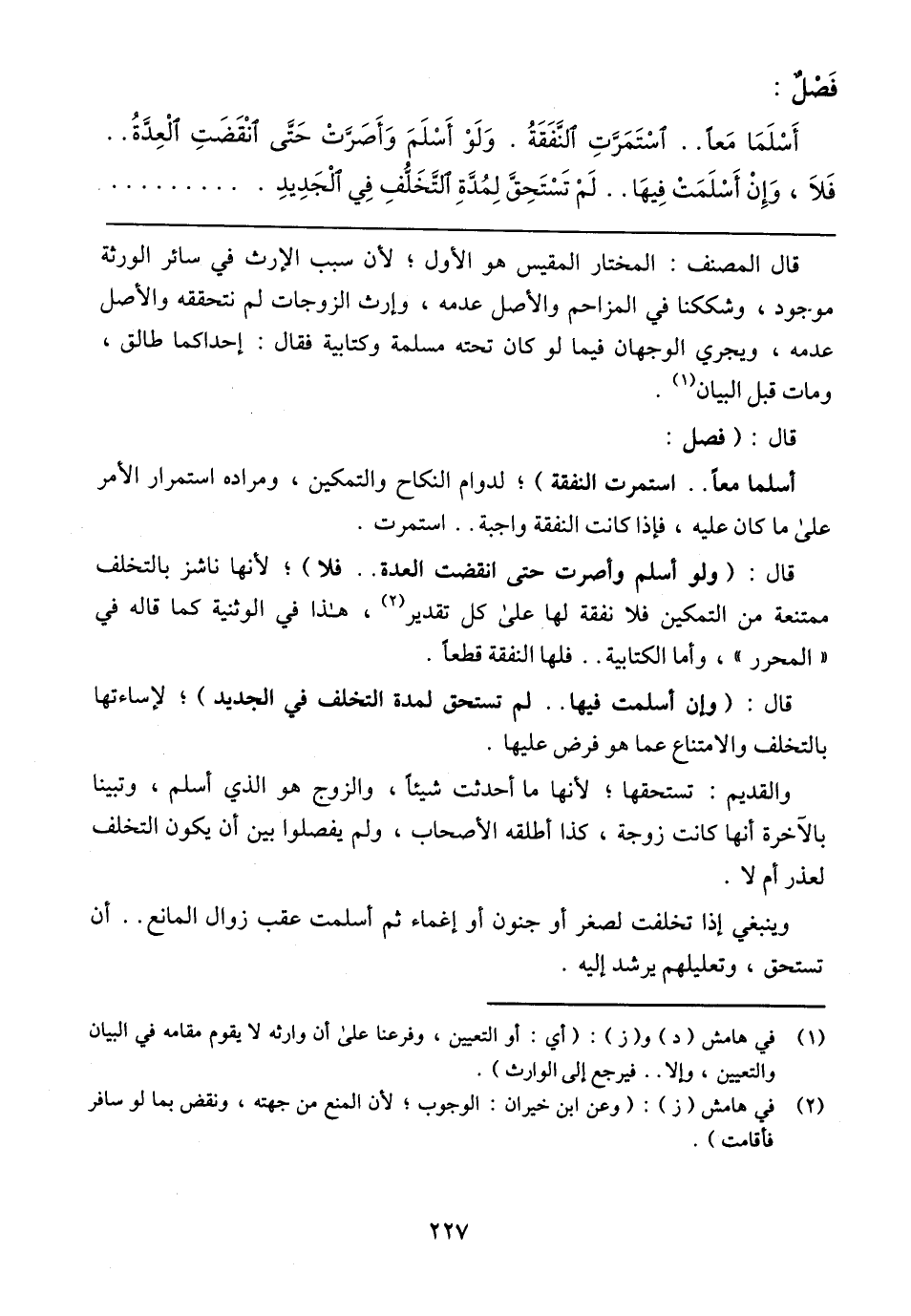 أَسْلَمَا معًا .. اسْتَمَرَّتِ النَّفَقَةُ. وَلَوْ أَسْلَمَ وَأَصَرَّتْ حَتَّى انْقَضَتِ الْعِدَّةُ .. فَلاَ، وَإِنْ أَسْلَمَتْ فِيهَا .. لَمْ تَسْتَحِقَّ لِمُدَّةِ التَّخَلُّفِ فِي الْجَدِيدِ