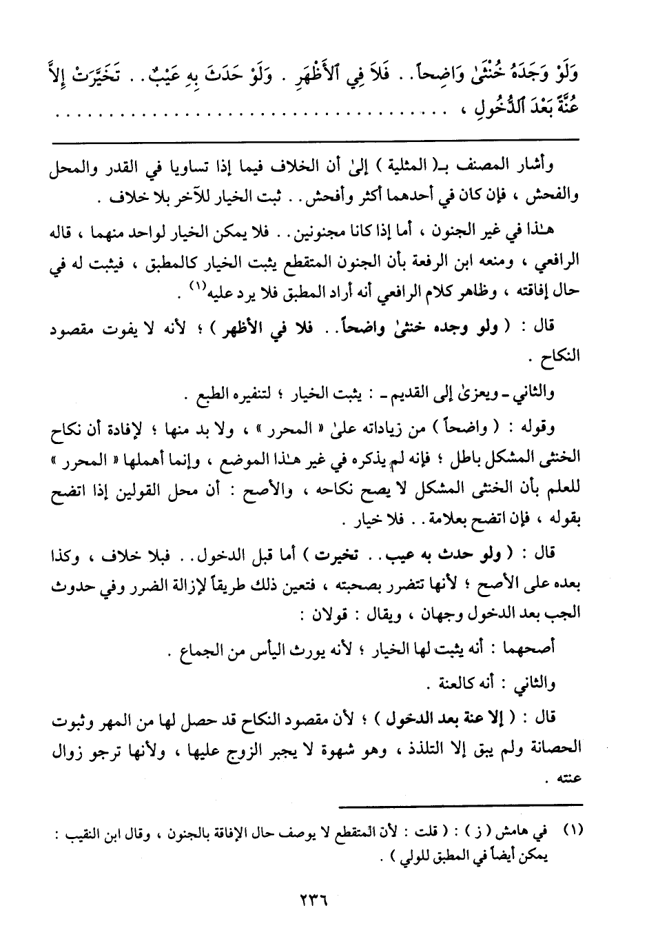 وقوله: (واضحًا) من زياداته على (المحرر)، ولابد منها؛ لإفادة أن نكاح الخنثى المشكل باطل؛ فإنه لم يذكره في غير هذا الموضع، وإنما أهملها (المحرر) للعلم بأن الخنثى المشكل لا يصح نكاحه، والأصح: أن محل القولين إذا اتضح بقوله، فإن اتضح بعلامة .. فلا خيار.