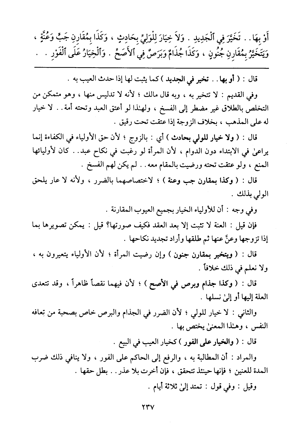 أَوْ بِهَا .. تَخَيَّرَ فِي الْجَدِيدِ. وَلاَ خِيَارَ لِلْوَلِيِّ بِحَادِثٍ، وَكَذَا بِمُقَارِنِ جَبٍّ وَعُنَّةٍ، وَيَتَخَيَّرُ بِمُقَارِنِ جُنُونٍ، وَكَذَا جُذَامٌ وَبَرَصٌ فِي الأَصَحِّ. وَالْخِيَارُ عَلَى الْفَوْرِ