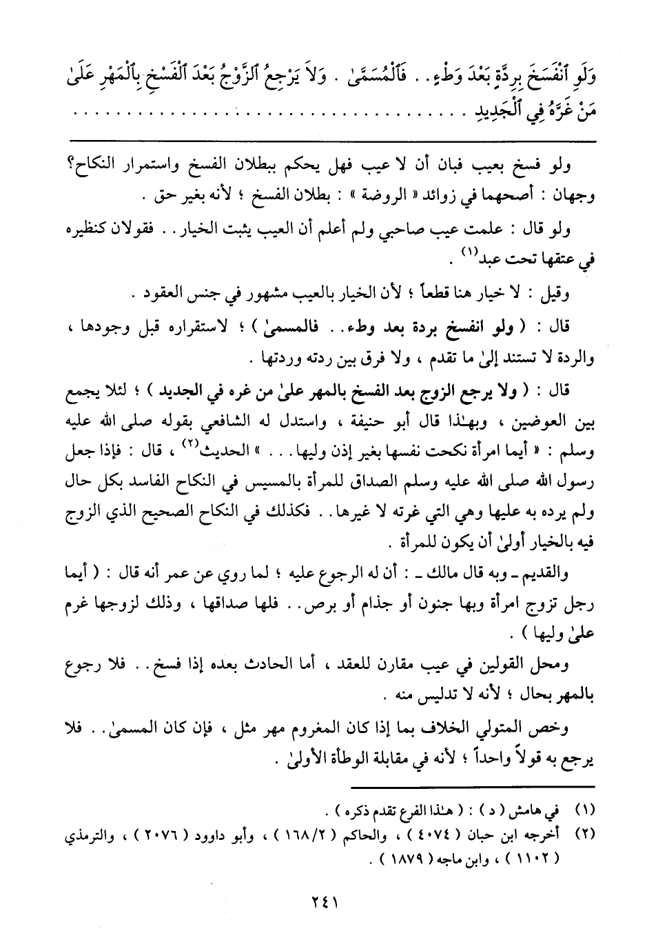 قال: (ولا يرجع الزوج بعد الفسخ بالمهر على من غره في الجديد)؛ لئلا يجمع بين العوضين، وبهذا قال أبو حنيفة، واستدل له الشافعي بقوله صلى الله عليه وسلم: (أيما امرأة نكحت نفسها بغير إذن وليها ...) الحديث، قال: فإذا جعل رسول الله صلى الله عليه وسلم الصداق للمرأة بالمسيس في النكاح الفاسد بكل حال ولم يرده به عليها وهي التي غرته لا غيرها .. فكذلك في النكاح الصحيح الذي الزوج فيه بالخيار أولى أن يكون للمرأة.