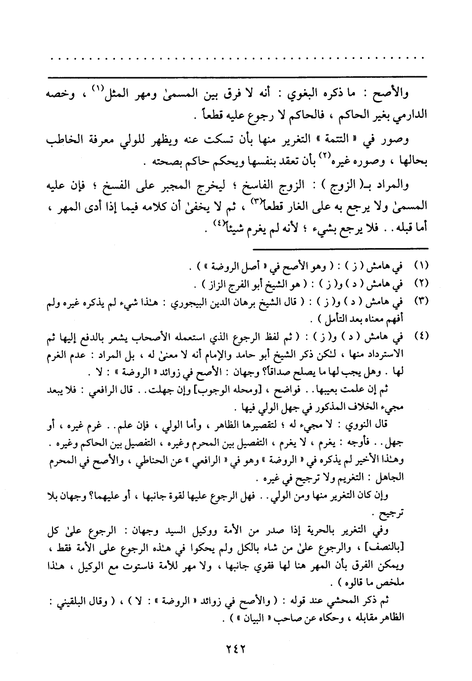 والأصح: ما ذكره البغوي: أنه لا فرق بين المسمى ومهر المثل، وخصه الدارمي بغير الحاكم، فالحاكم لا رجوع عليه قطعًا.