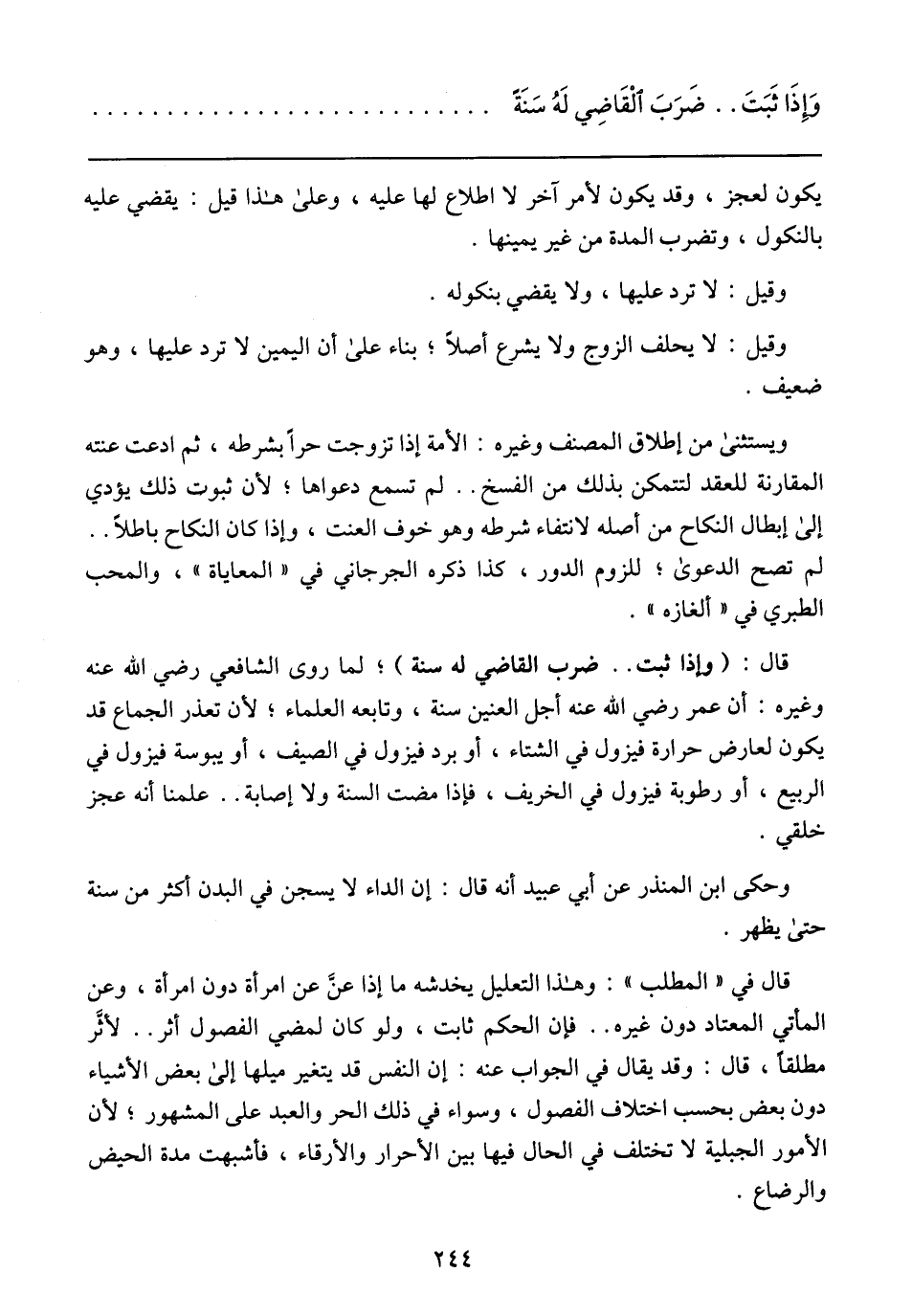 قال: (وإذا ثبت .. ضرب القاضي له سنة)؛ لما روى الشافعي رضي الله عنه وغيره: أن عمر رضي الله عنه أجل العنين سنة، وتابعه العلماء، لأن تعذر الجماع قد يكون لعارض حرارة فيزول في الشتاء، أو برد فيزول في الصيف، أو يبوسة فيزول في الربيع، أو رطوبة فيزول في الخريف، فإذا مضت السنة ولا إصابة .. علمنا أنه عجز خلقي.