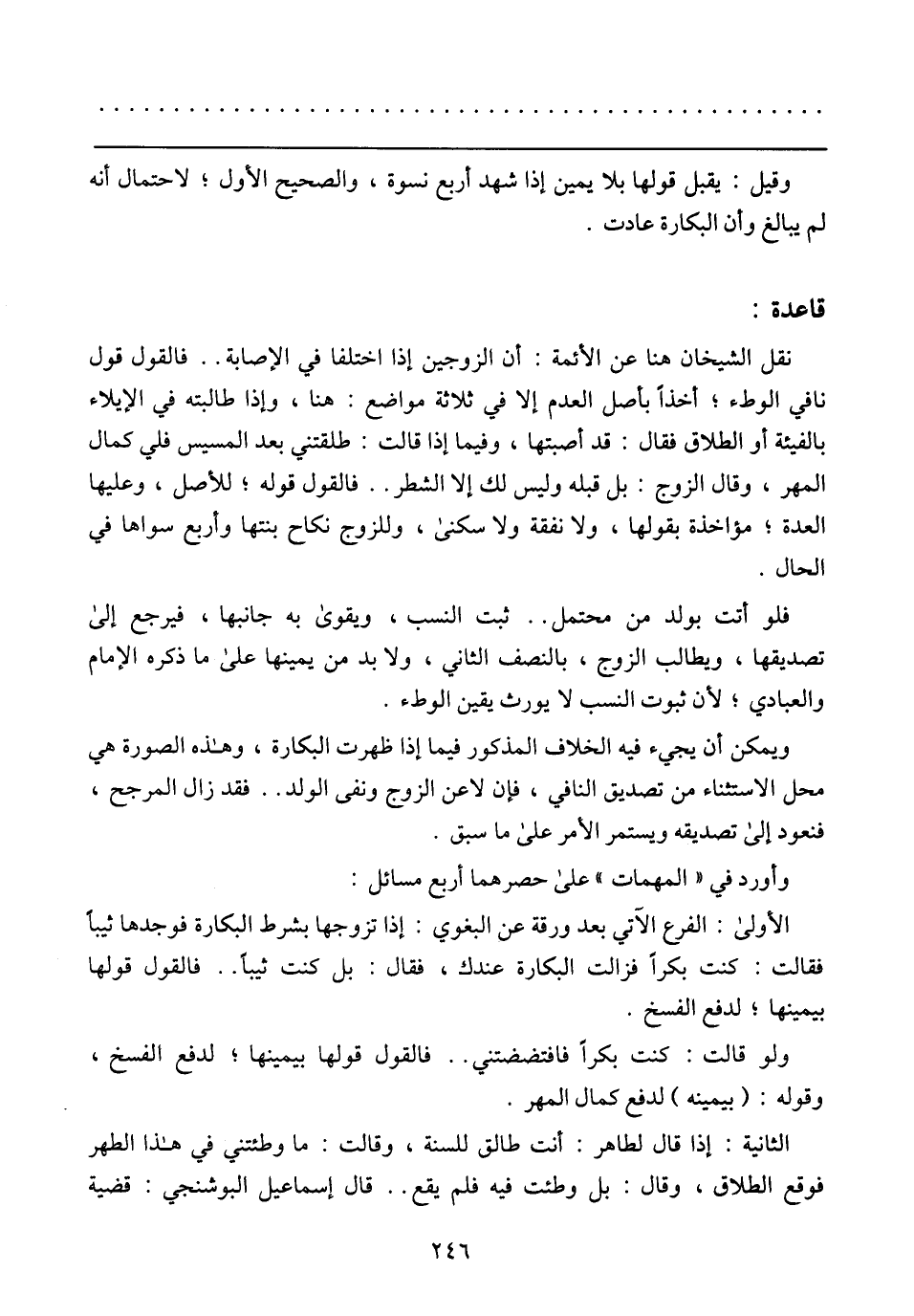 الأولى: الفرع الآتي بعد ورقة عن البغوي: إذا تزوجها بشرط البكارة فوجدها ثيبًا فقالت: كنت بكرًا فزالت البكارة عندك، فقال: بل كنت ثيبًا .. فالقول قولها بيمينها؛ لدفع الفسخ.