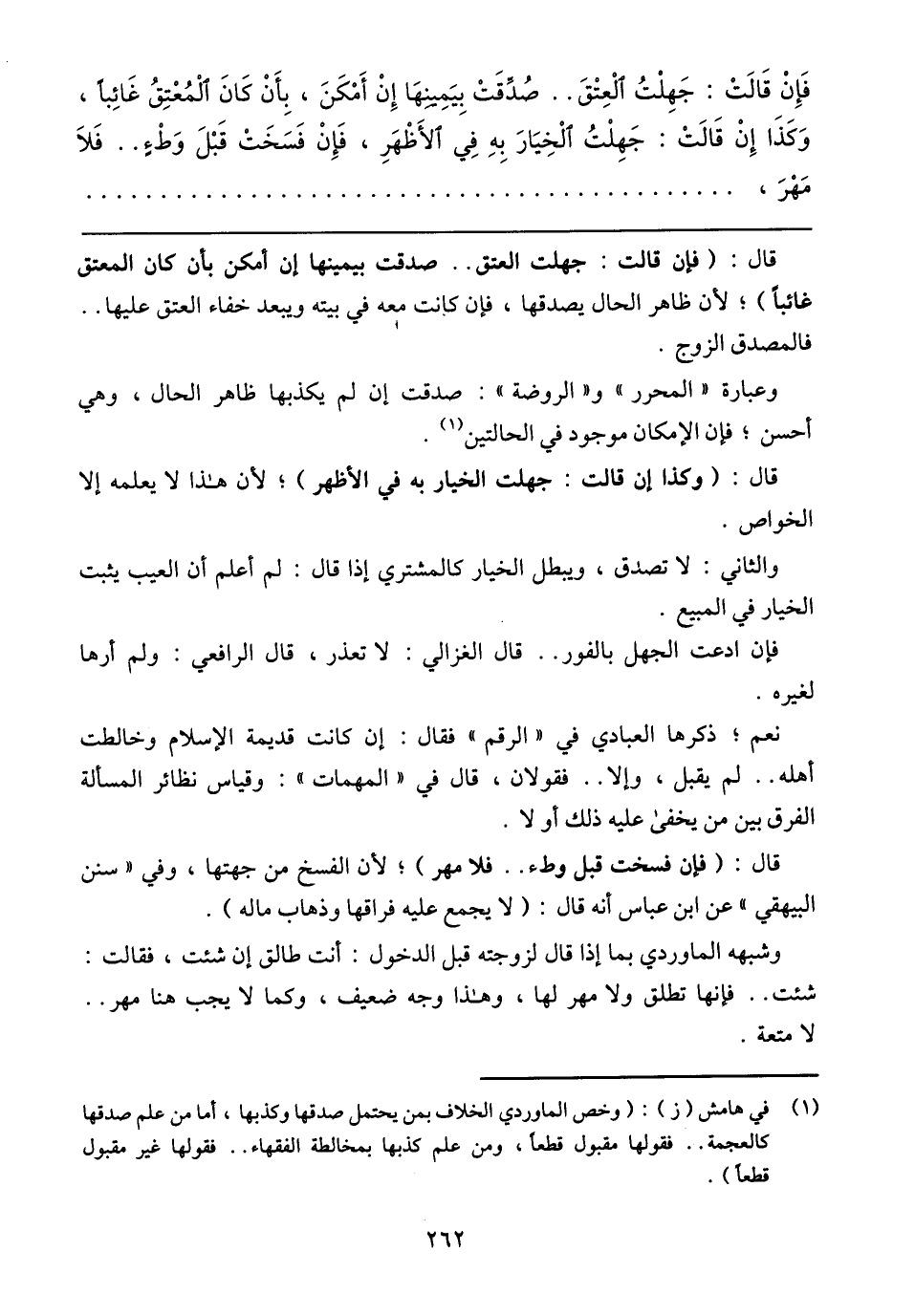 قال: (فإن قالت: جهلت العتق .. صدقت بيمينها إن أمكن بأن كان المعتق غائبًا)؛ لأن ظاهر الحال يصدقها، فإن كانت معه في بيته ويبعد خفاء العتق عليها .. فالمصدق الزوج.