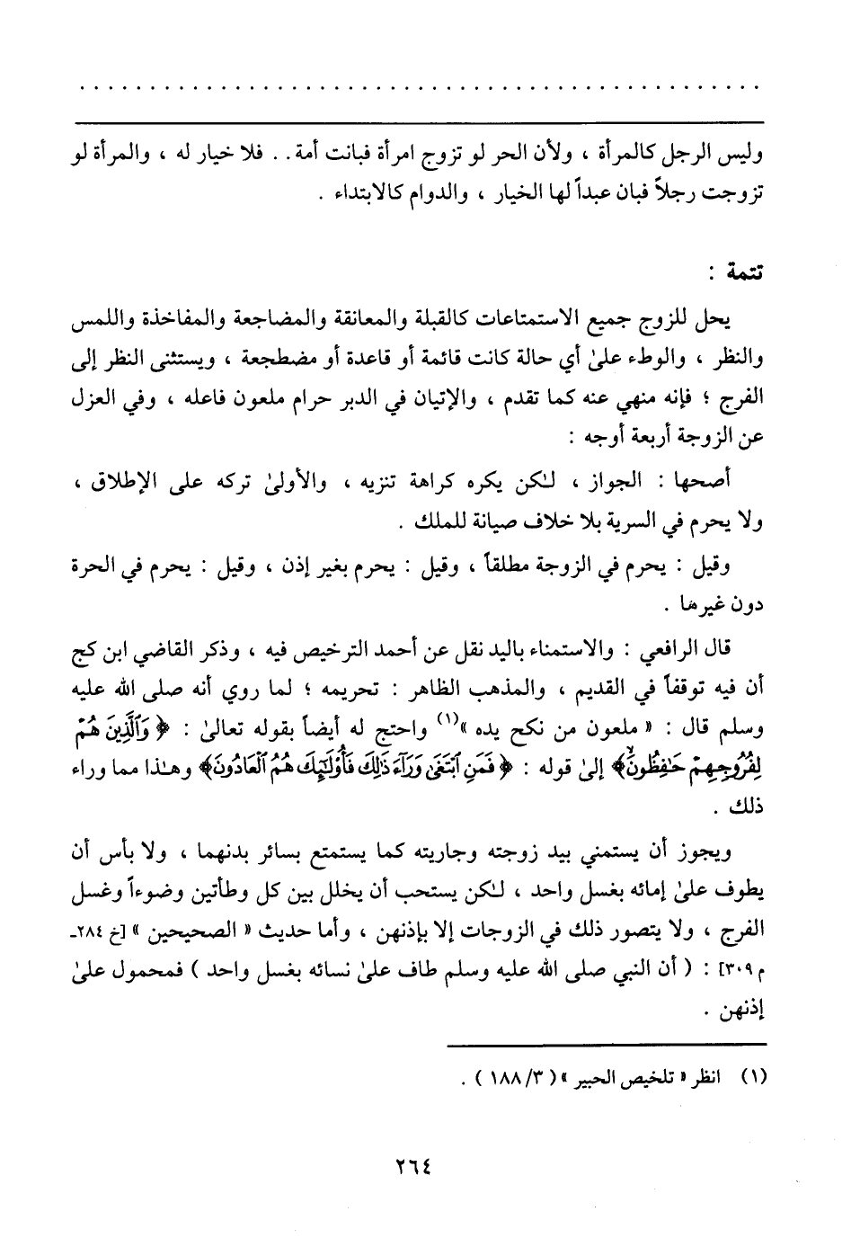 قال الرافعي: والاستمناء باليد نقل عن أحمد الترخيص فيه، وذكر القاضي ابن كج أن فيه توقفًا في القديم، والمذهب الظاهر: تحريمه؛ لما روي أنه صلى الله عليه وسلم قال: (ملعون من نكح يده) واحتج له أيضًا بقوله تعالى: {وَالَّذِينَ هُمْ لِفُرُوجِهِمْ حَفِظُونَ} إلى قوله: {فَمَنِ ابْتَغَى وَرَاءَ ذَلِكَ فَأُوْلَئِكَ هُمُ الْعَادُونَ} وهذا مما وراء ذلك.