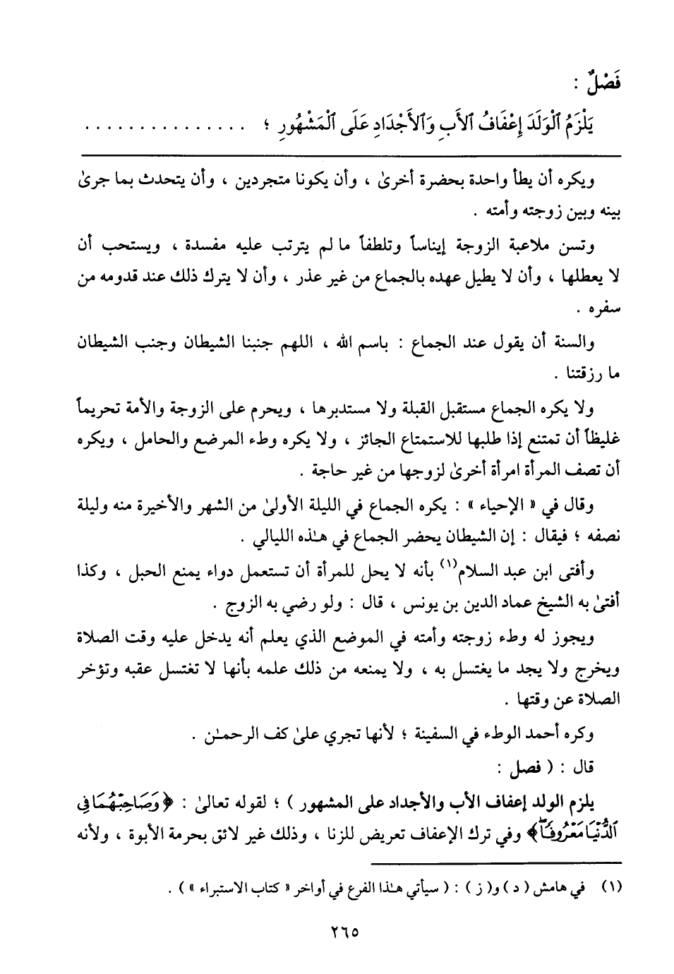 يَلْزَمُ الْوَلَدَ إِعْفَافُ الأَبِ وَالأَجْدَادِ عَلَى الْمَشَهُورِ؛