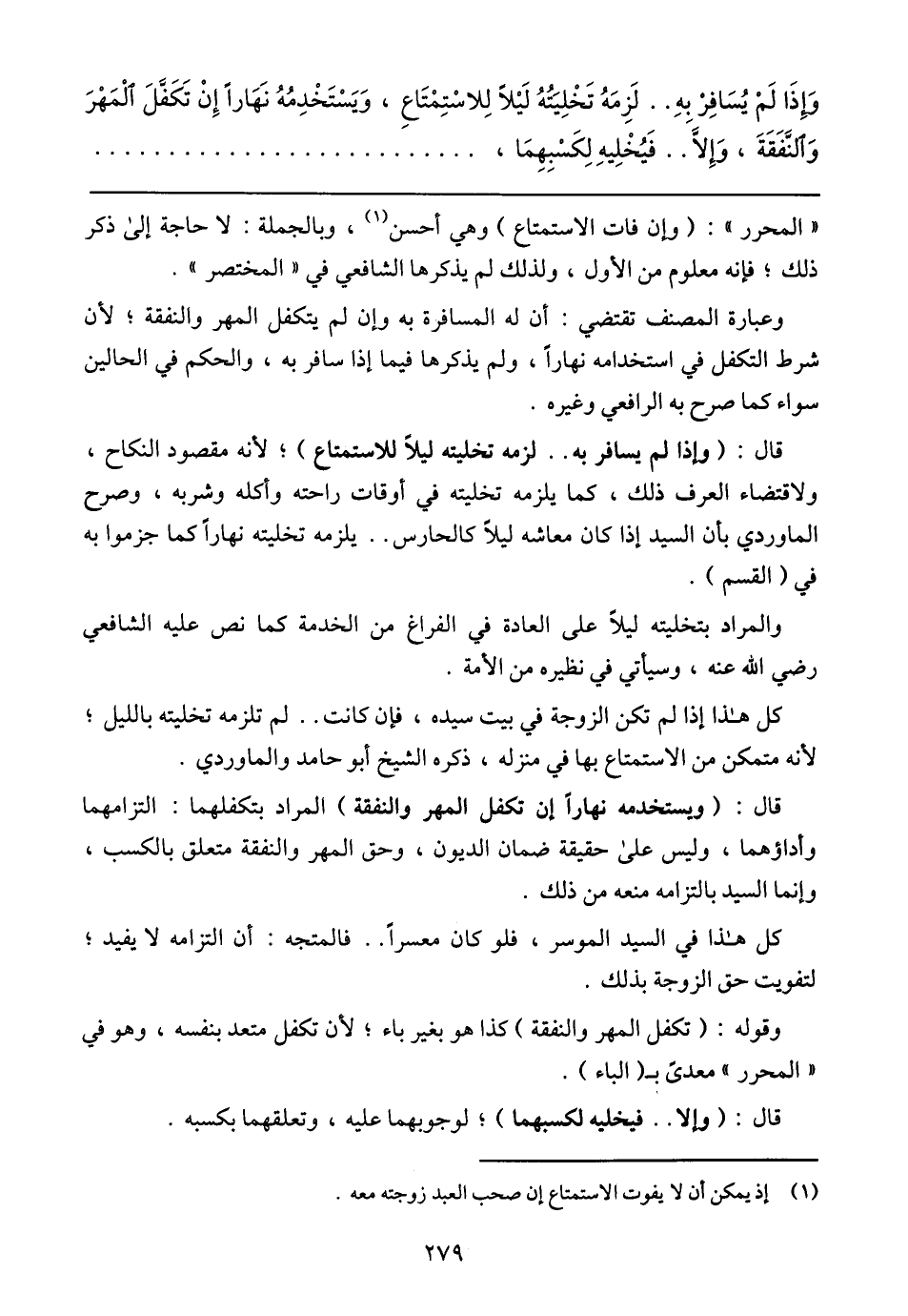 وعبارة المصنف تقتضي: أن له المسافرة به وإن لم يتكفل المهر والنفقة؛ لأن شرط التكفل في استخدامه نهارًا، ولم يذكرها فيما إذا سافر به، والحكم في الحالين سواء كما صرح به الرافعي وغيره.