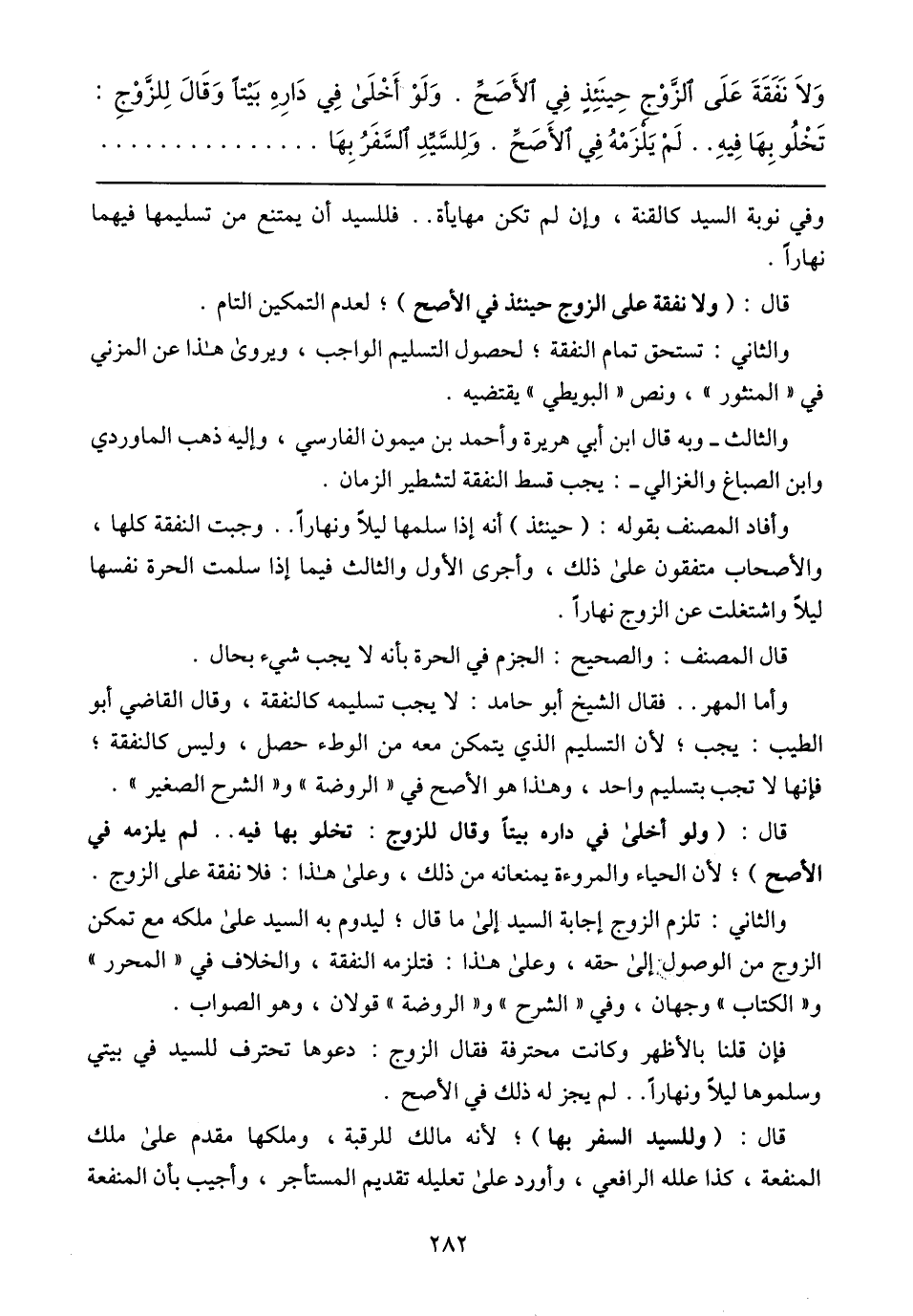 وَلاَ نَفَقَةَ عَلَى الْزَّوْجِ حِينَئِذٍ فِي الأَصَحِّ. وَلَوْ أخْلَى فِي دَارِهِ بَيْتًا وَقَالَ لِلزَّوْجِ: تَخْلُو بِهَا فِيهِ .. لَمْ يَلْزَمْهُ فِي الأَصَحِّ. وَلِلسِّيِّدِ الْسَفَرُ بِهَا