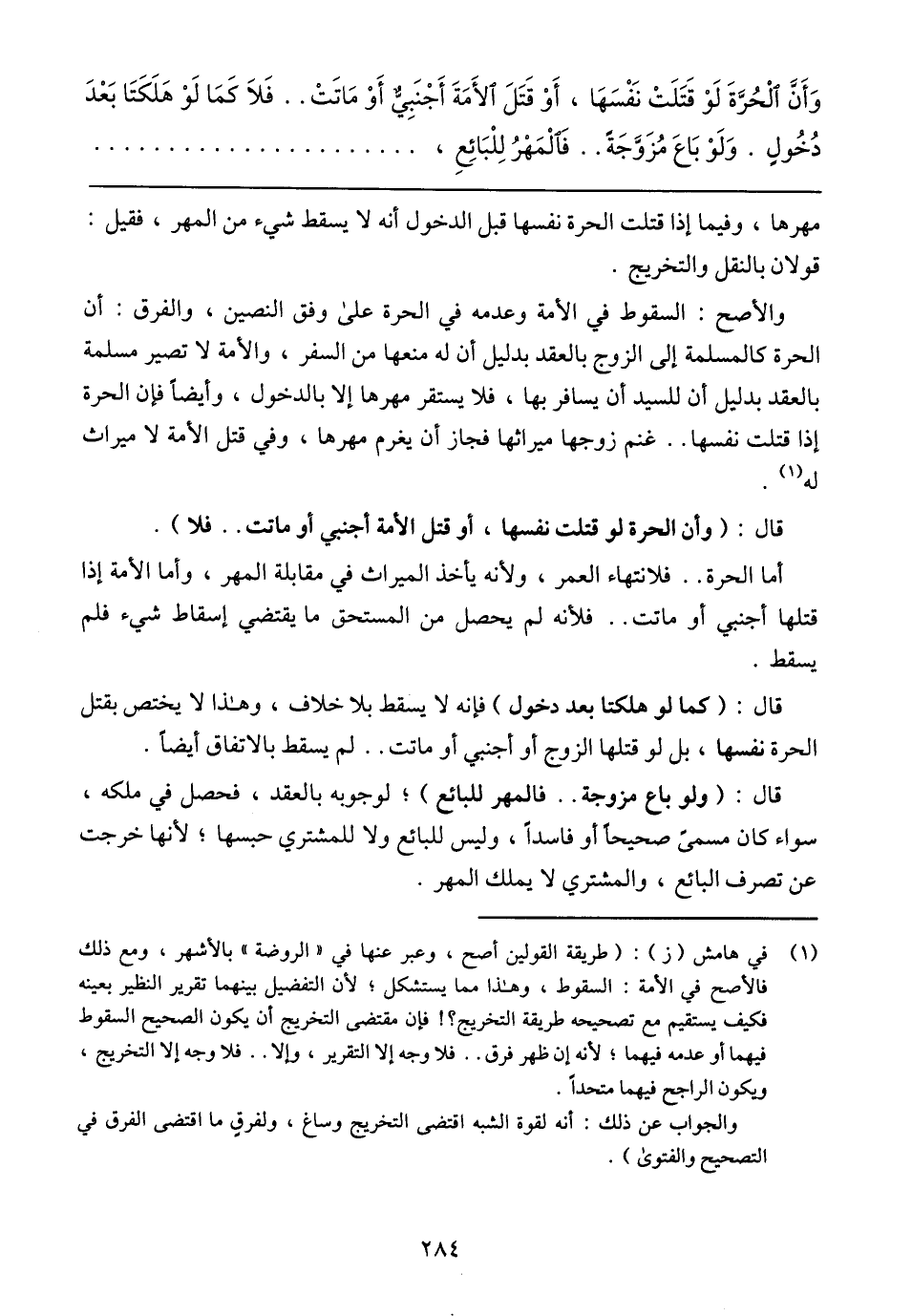 وَأَنَّ الْحُرَّةَ لَوْ قَتَلَتْ نَفْسَهَا، أَوْ قَتَلَ الأَمَةَ أَجْنَبِيٌّ أَوْ مَاتَتْ .. فَلاَ كَمَا لَوْ هَلَكتَا بَعْدَ دُخُولٍ. وَلَوْ بَاعَ مُزُوَّجَةً .. فَالْمَهْرُ لِلبَائِعِ،