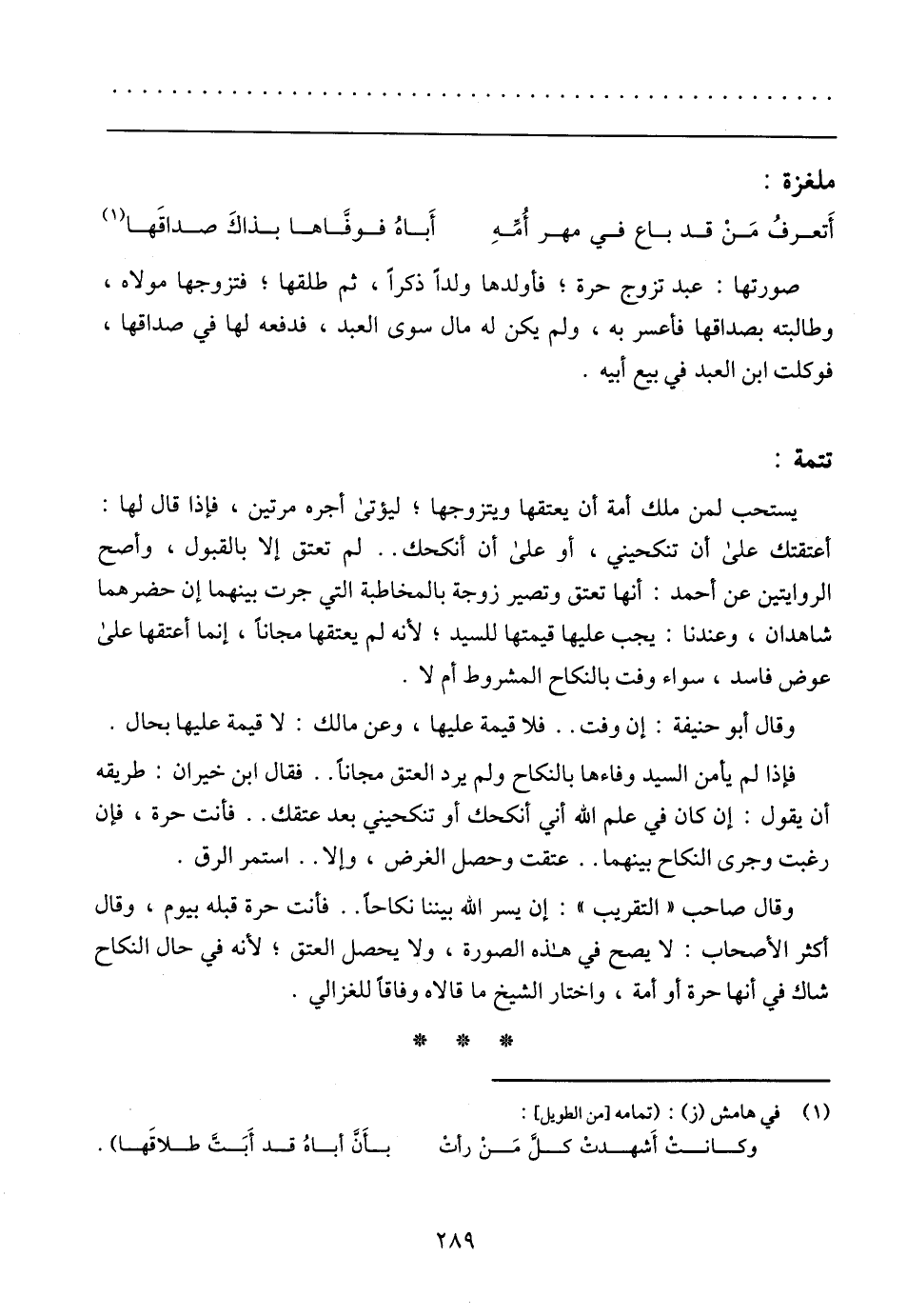 يستحب لمن ملك أمة أن يعتقها ويتزوجها؛ ليؤتى أجره مرتين، فإذا قال لها: أعتقتك على أن تنكحيني، أو على أن أنكحك .. لم تعتق إلا بالقبول، وأصح الروايتين عن أحمد: أنها تعتق وتصير زوجة بالمخاطبة التي جرت بينهما إن حضرهما شاهدان، وعندنا: يجب عليها قيمتها للسيد؛ لأنه لم يعتقها مجانًا، إنما أعتقها على عوض فاسد، سواء وفت بالنكاح المشروط أم لا.