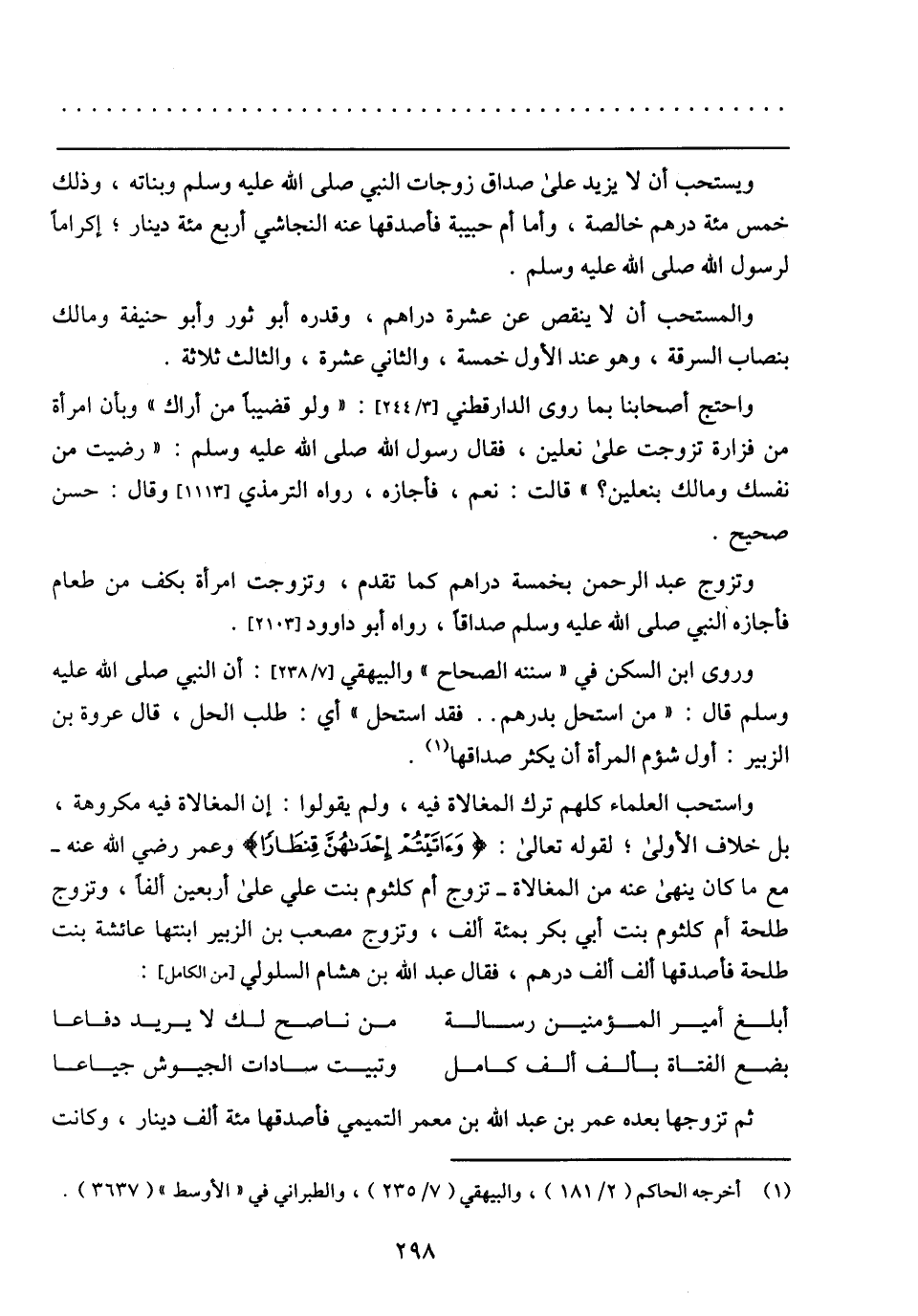 ويستحب أن لا يزيد على صداق زوجات النبي صلى الله عليه وسلم وبناته، وذلك حمس مئة درهم خالصة، وأما أم حبيبة فأصدقها عنه النجاشي أربع مئة دينار؛ إكرامًا لرسول الله صلى الله عليه وسلم.