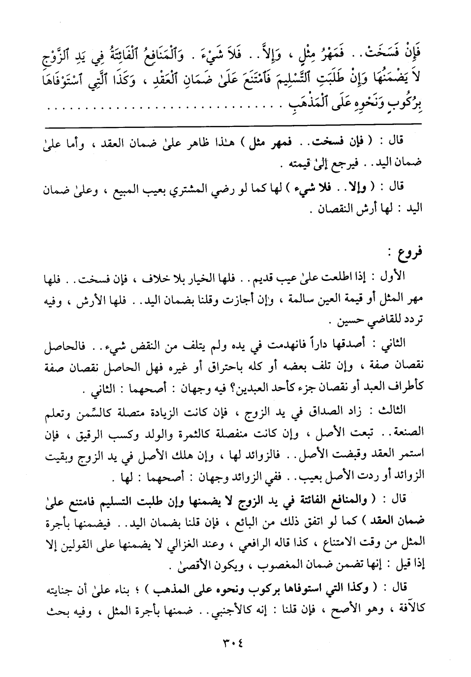 فَإِنْ فَسَخَتْ .. فَمَهْرُ مِثْلِ، وَإِلاَّ .. فَلاَ شَيْءَ. وَاَلْمَنَافِعُ اَلْفَائِتَةُ فِي يَدِ اَلزَّوْجِ لاَ يَضْمَنُهَا وَإِنْ طَلَبَتَ اَلْتَسْلِيمَ فَأَمْتَنَعَ عَلَى ضَمَانِ اَلْعَقْدِ، وَكَذَا اَلْتِي اَسْتَوْفَاهَا بِرُكُوبِ وَنَحْوِهِ عَلَى اَلْمَذْهَبِ
