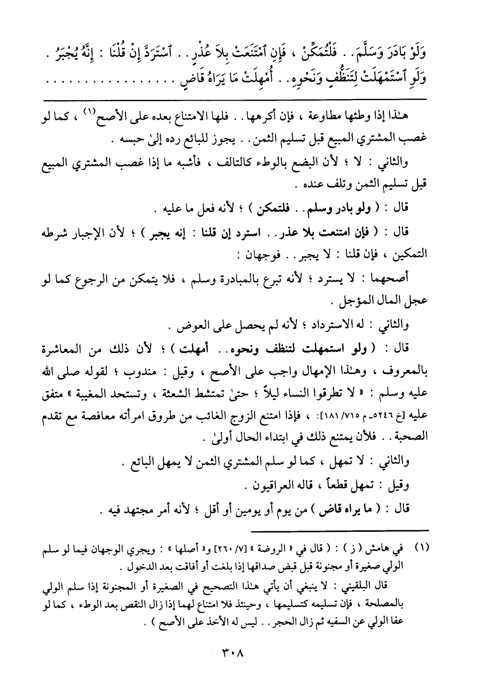 وَلَوْ بَادَرَ وَسَلَّمَ .. فَلْتُمَكِّنَ، فَإِنِ أمْتَنَعَتْ بِلاَ عُذْرٍ .. اُسْتَرَدَّ إِنْ قُلْنَا .. إِنَّهُ يُجْبَرُ. وَلَوِ اَسْتَمْهَلَتْ لِتَنَظًّفِ وَنَحْوِهِ .. أُمْهِلَتْ مَا يَرَاهُ فَاضٍ