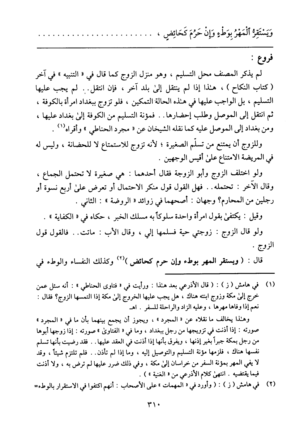 لم يذكر المصنف محل التسليم، وهو منزل الزوج كما قال في (التنبيه) في آخر (كتاب النكاح)، هذا إذا لم ينتقل إلى بلد آخر، فإن انتقل .. لم يجب عليها التسليم، بلم الواجب عليها في هذه الحالة التمكين، فلو تزوج ببغداد امرأة بالكوفة، ثم انتقل إلى الموصل وطلب إحضارها .. فمؤنة التسليم من الكوفة إلى بغداد عليها، ومن بغداد إلى الموصل عليه كما نقله الشيخان عن (مجرد الحناطي) وأقراه.