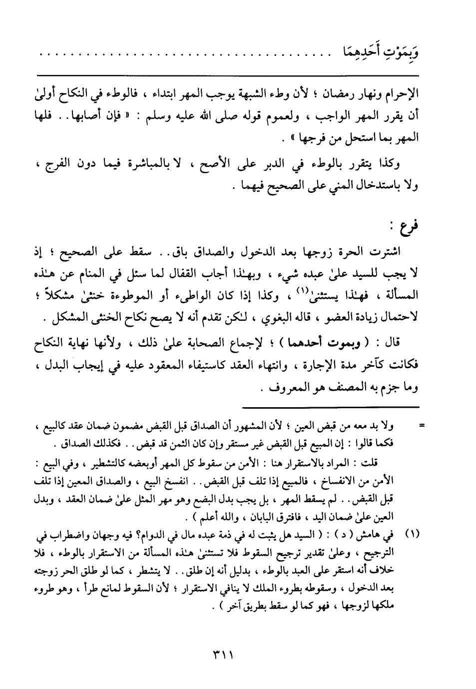 اشترت الحرة زوجها بعد الدخول والصداق باق .. سقط على الصحيح؛ إذ لا يجب للسيد على عبده شيء، وبهذا أجاب القفال لما سئل في المنام عن هذه المسألة، فهذا يستثنى، وكذا إذا كان الواطئ أو الموطوءة خنثى مشكلاً؛ لاحتمال زيادة العضو، قاله البغوي، لكن تقدم أنه لا يصح نكاح الخنثى المشكل.