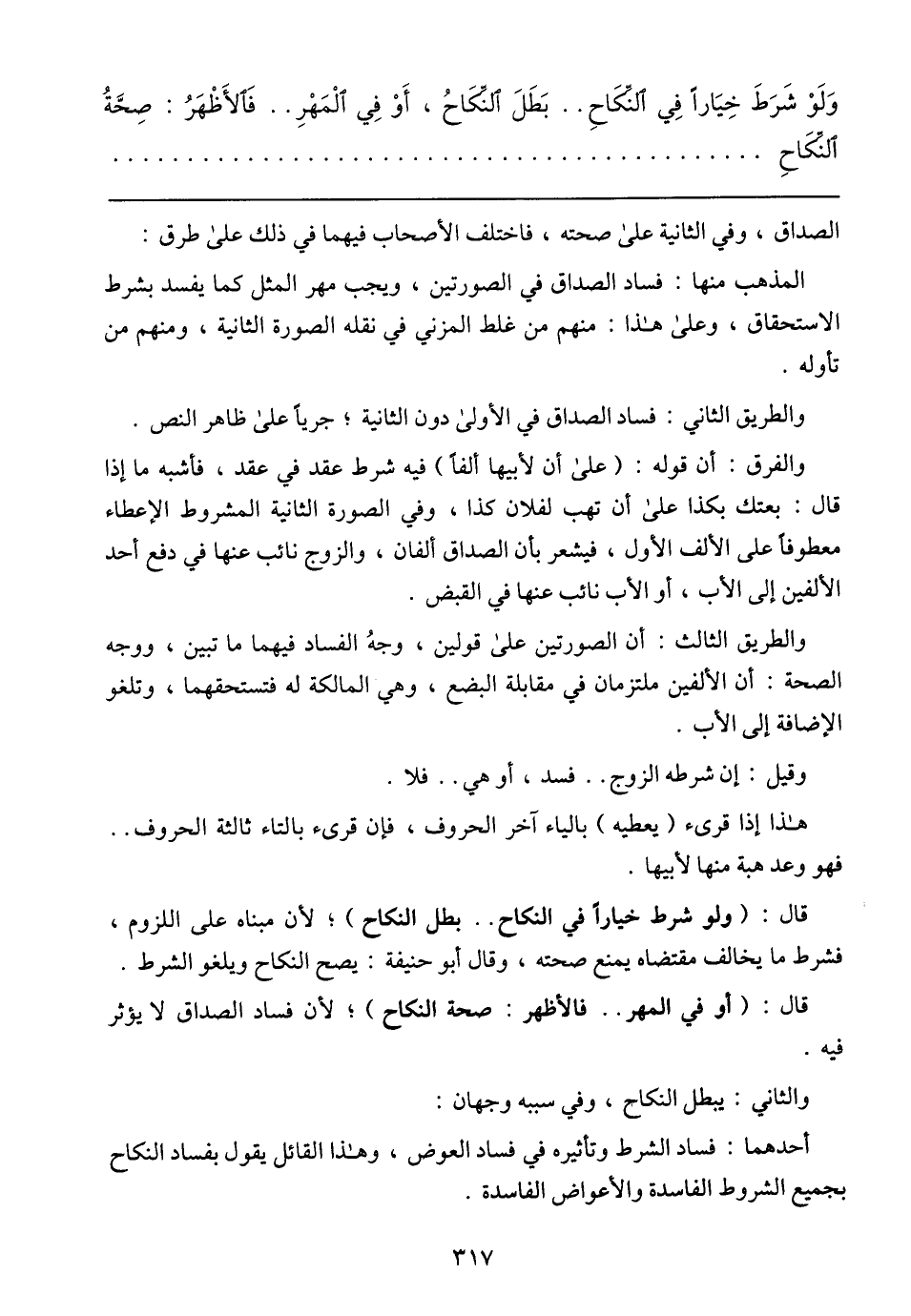 أحدهما: فساد الشرط وتأثيره في فساد العوض، وهذا القائل يقول بفساد النكاح بجميع الشروط الفاسد والأعواض الفاسدة.