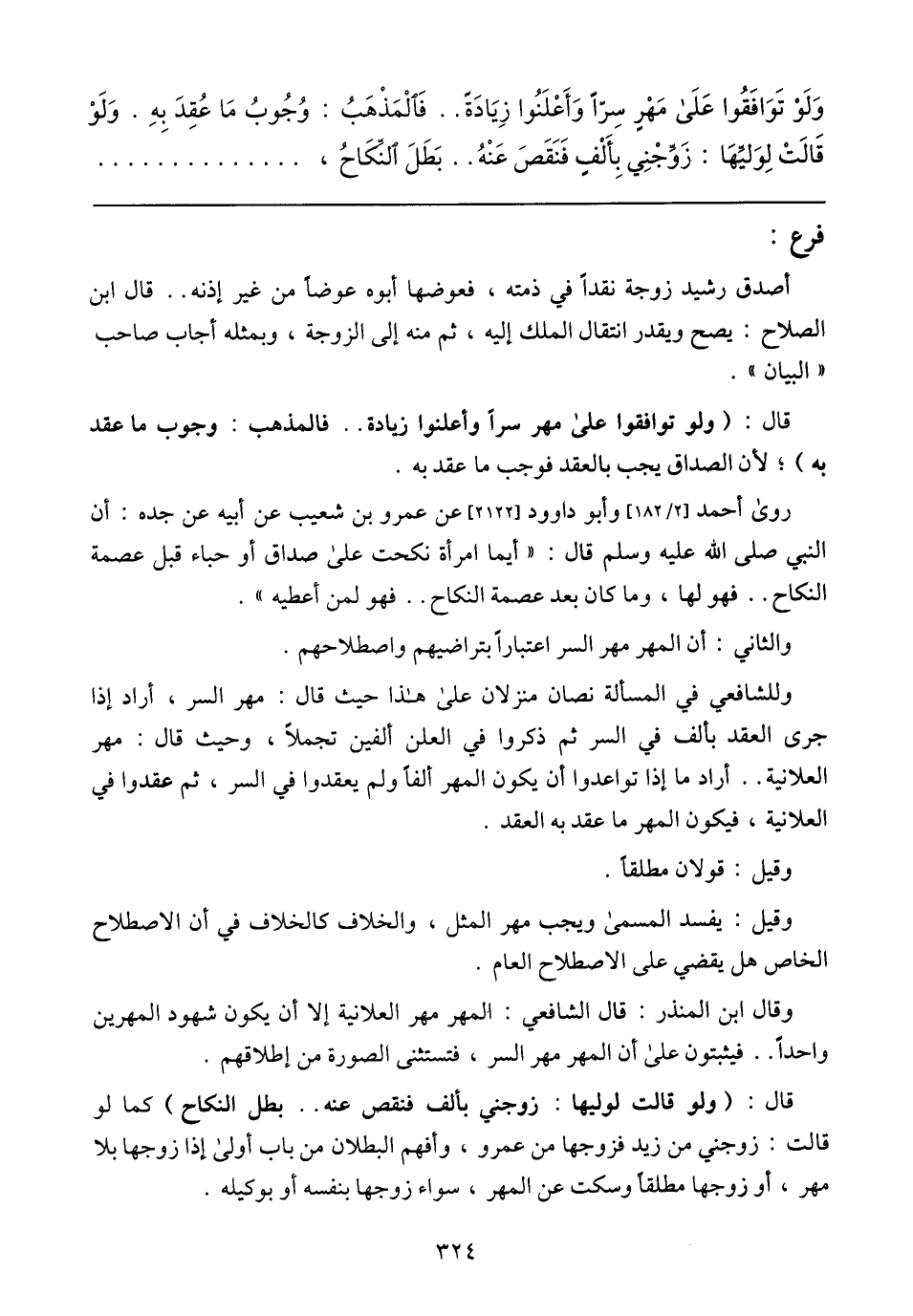 وَلَوْ تَوَافَقْوا عَلَى مَهْرِ سِرّاً وَأَعْلَنُوا زِيَادَةَ .. فَاَلْمَذْهَبُ: وُجُوبُ مَا عُقِدَ بِهِ. وَلَوْ قَالَتْ لِوليِّهَا: زَوِّجْنِي بِأَلْفٍ فَنَقَصَ عَنْهُ .. بَطَلَ اَلْنِّكَاحَ،