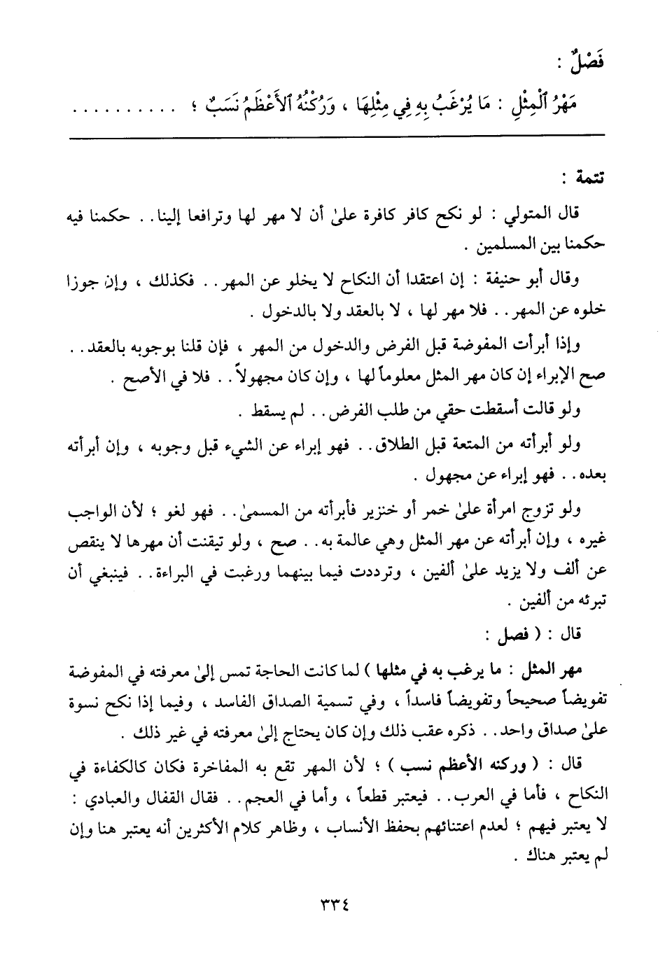 قال: (وركنه الأعظم نسب)؛ لأن المهر تقع به المفاخرة فكان كالكفاءة في النكاح، فأما في العرب .. فيعتبر قطعًا، وأما في الهجم .. فقال القفال والعبادي: النكاح، فأما في العرب .. فيعتبر قطعًا، وأما في العجم .. فقال القفال والعبادي: لا يعتبر فيهم؛ لعدم اعتنائهم بحفظ الأنساب، وظاهر كلام الأكثرين أنه يعتبر هنا وإن لم يعتبر هناك.