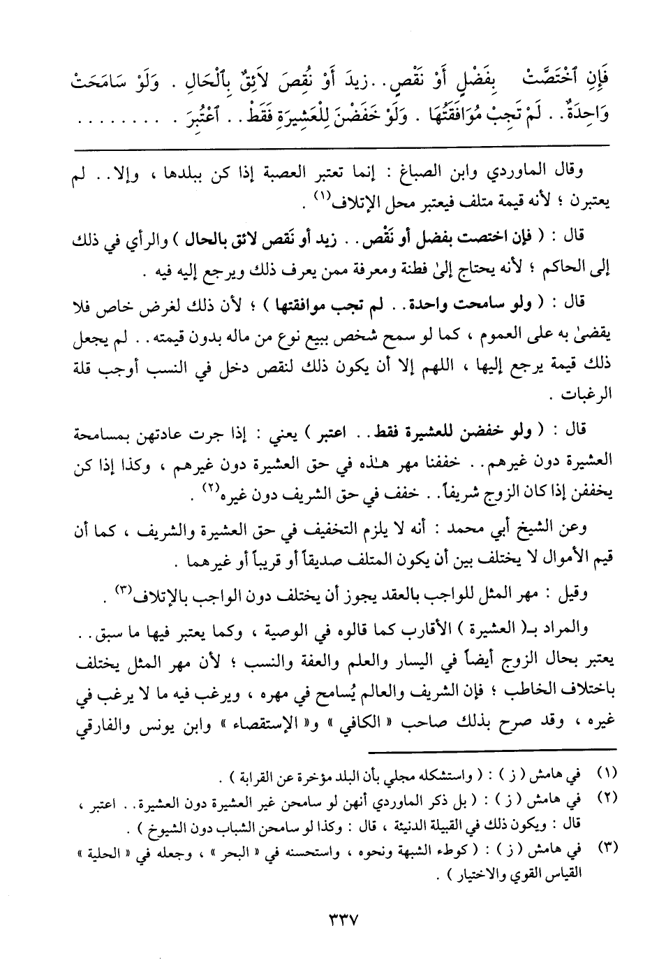 فَإِنِ اَخْتَصَّتُ بِفَضْلٍ أَوْ نُقِصَ .. زيدَ أَوْ نُقِصَ لَائِقٌ بِاَلْحَالَ. وَلَوْ سَامَحَتْ وَاحِدَةٌ .. لَمْ تَجِبْ مُوَافَقَتُهَا. وَلَوْ خَفَضْنَ لِلْعَشِيرَةِ فَقَطْ .. اعْتُبِرَ