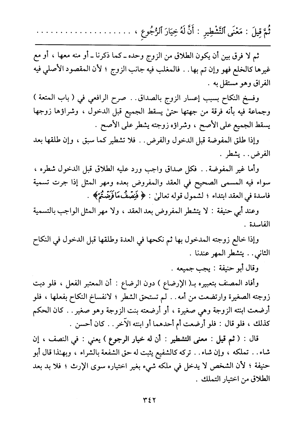 قال: (ثم قيل: معنى التشطير: أن له خيار الرجوع) يعني: في النصف، إن شاء .. تملكه، وإن شاء .. تركه كالشفيع يثبت له حق الشفعة بالشراء، وبهذا قال أبو حنيفة؛ لأن الشخص لا يدخل في ملكه شيء بغير اختياره سوى الإرث؛ فلابد بعد الطلاق من اختيار التملك.