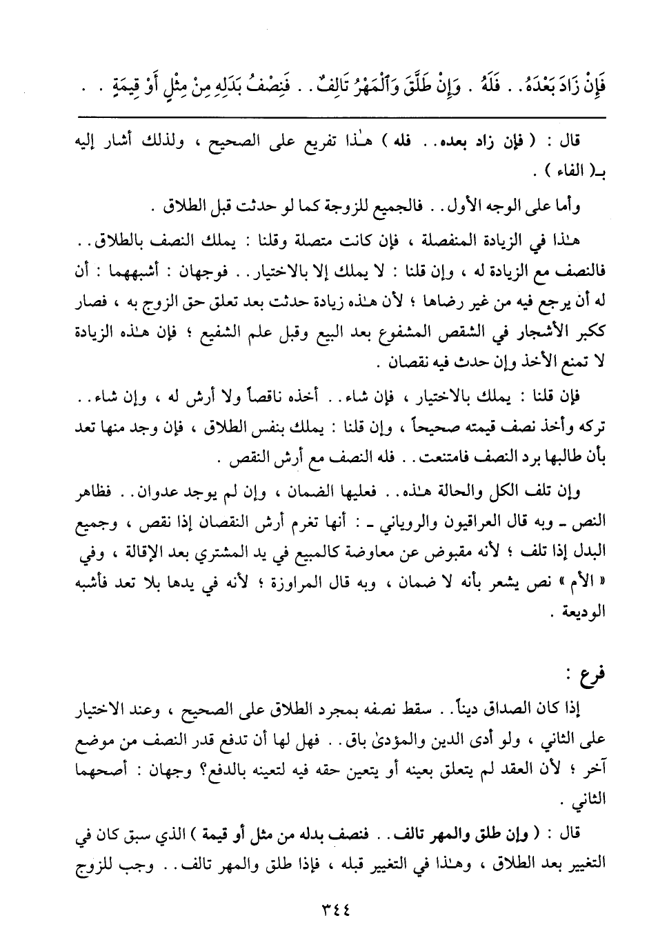 هذا في الزيادة المنفصلة، فإن كانت متصلة وقلنا: يملك النصف بالطلاق .. فالنصف مع الزيادة له، وإن قلنا: لا يملك إلا بالاختيار .. فوجهان: أشبههما: أن له أن يرجع فيه من غير رضاها؛ لأن هذه زيادة حدثت بعد تعلق حق الزوج به، فصار ككبر الأشجار في الشقص المشفوع بعد البيع وقبل علم الشفيع؛ فإن هذه الزيادة لا تمنع الأخذ وإن حدث فيه نقصان.