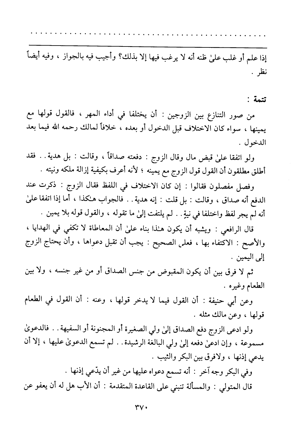 ولو ادعى الزوج دفع الصداق إلى ولي الصغيرة أو المجنونة أو السفيهة .. فالدعوى مسموعة، وإن ادعى دفعه إلى ولي البالغة الرشيدة .. لم تسمع الدعوى عليها، إلا أن يدعي إذنها، ولا فرق بين البكر والثيب.
