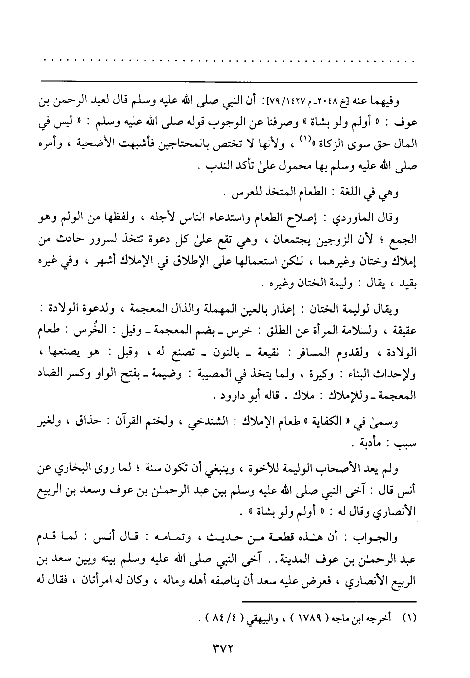 وفيهما عنه [خ 2048 - م 1427/ 79]: أن النبي صلي الله عليه وسلم قال لعبد الرحمن بن عوف: (أولم ولو بشاة) وصرفنا عن الوجوب قوله صلي الله عليه وسلم: (ليس في المال حق سو الزكاة)، ولأنها لا تختص بالمختاجين فأشبهت الأضحية، وأمره صلي الله ليه وسلم بها محمول على تأكد الندب.