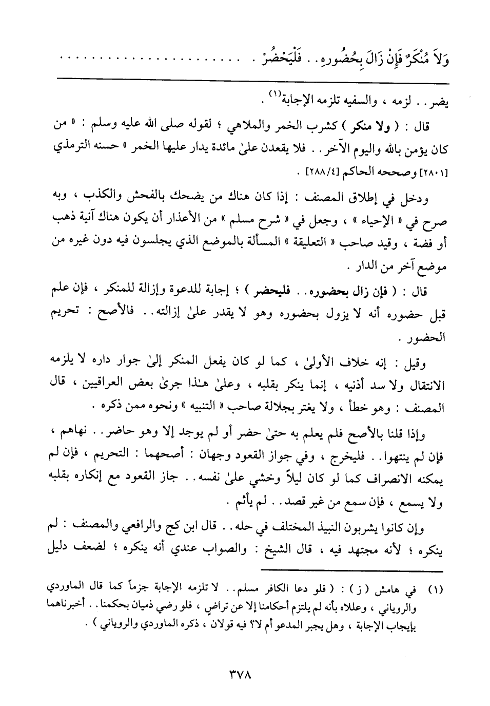 وإذا قلنا بالأصح فلم يعلم به حتى حضر أو لم يوجد إلا وهو حاضر .. نهاهم، فإن لم ينتهوا .. فليخرج، وفي جواز القعود وجهان: أصحهما: التحريم، فإن لم يمكنه الانصراف كما لو كان ليلاً وخشي على نفسه .. جاز القعود مع إنكاره بقلبه ولا يسمع، فإن سمع من غير قصد .. لم يأثم.