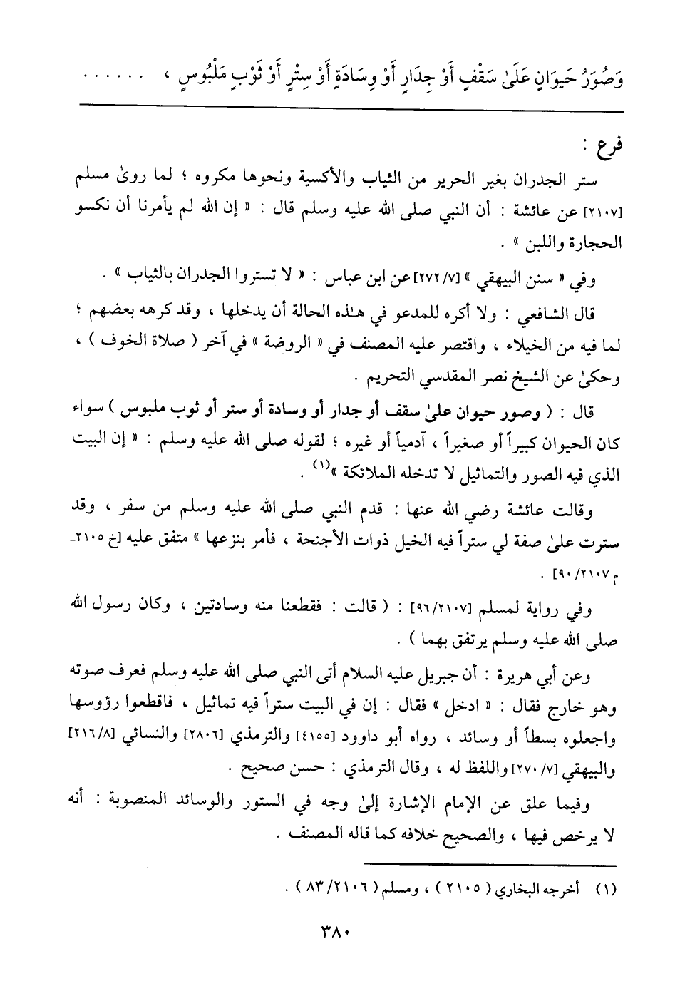 قال: (وصور حيوان على سقف أو جدار أو وسادة أو ستر أو ثوب ملبوس) سواء كان الحيوان كبيرًا أو صغيرًا، آدميًا أو غيره؛ لقوله صلي الله عليه وسلم: (إن البيت الذي فيه الصور والتماثيل لا تدخله الملائكه).