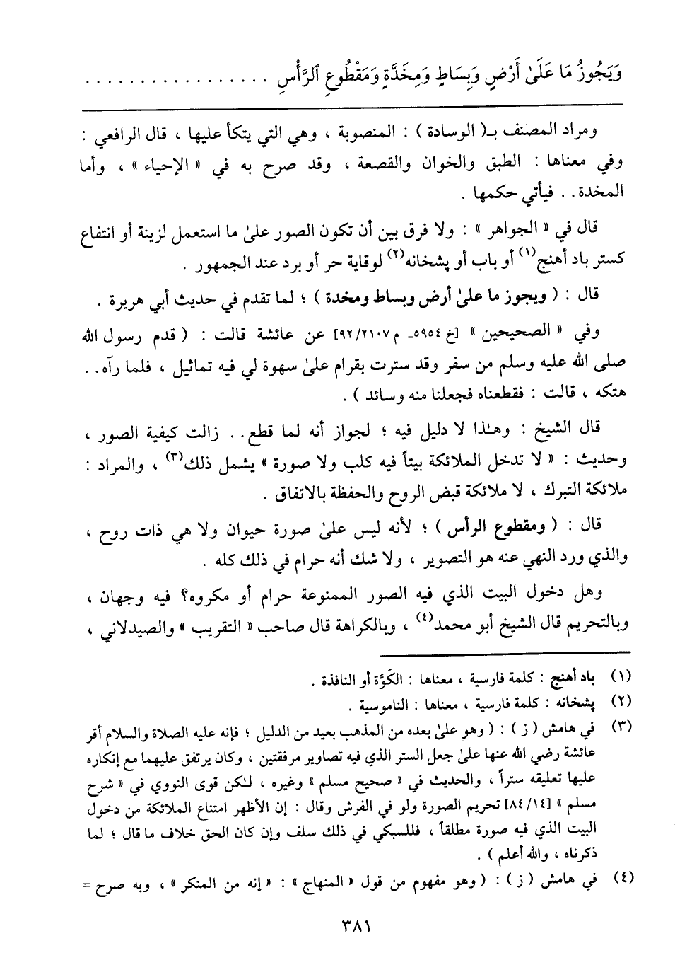 ومراد المصنف بـ (الوسادة): المنصوبة، وهي التي يتكأ عليها، قال الرافعي: وفي معناها: الطبق والخوان والقصعة، وقد صرح به في (الإحياء)، وأما المخدة .. فيأتي حكمها.