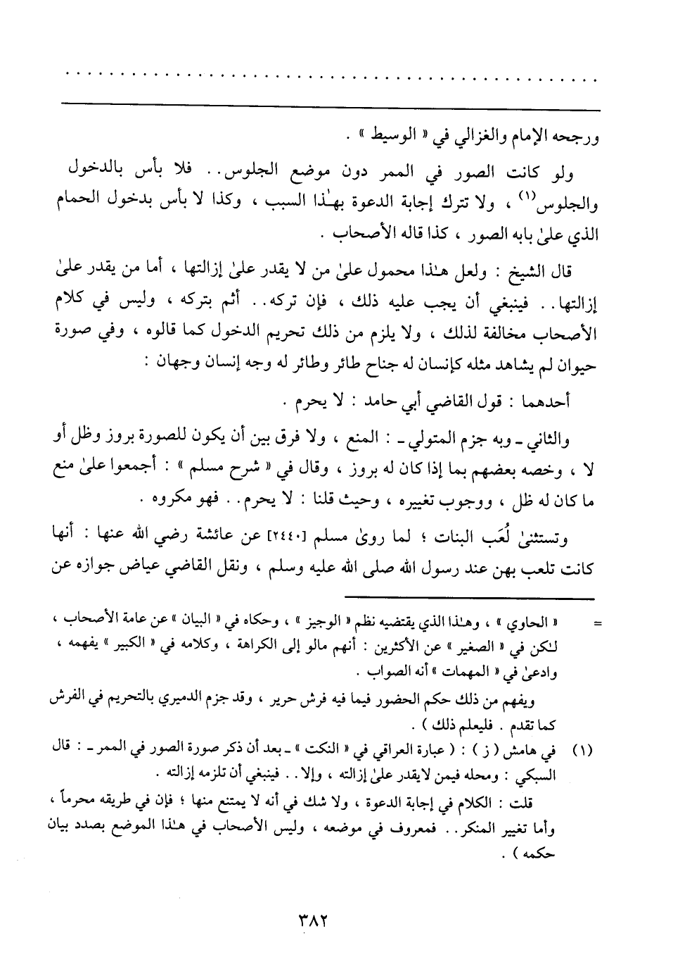 ولو كانت الصور في الممر دون موضع الجلوس .. فلا بأس بالدخول والجلوس، ولا تترك إجابة الدعوة بهذا السبب، وكذا لا بأس بدخول الحمام الذي على بابه الصور، كذا قاله الأصحاب.