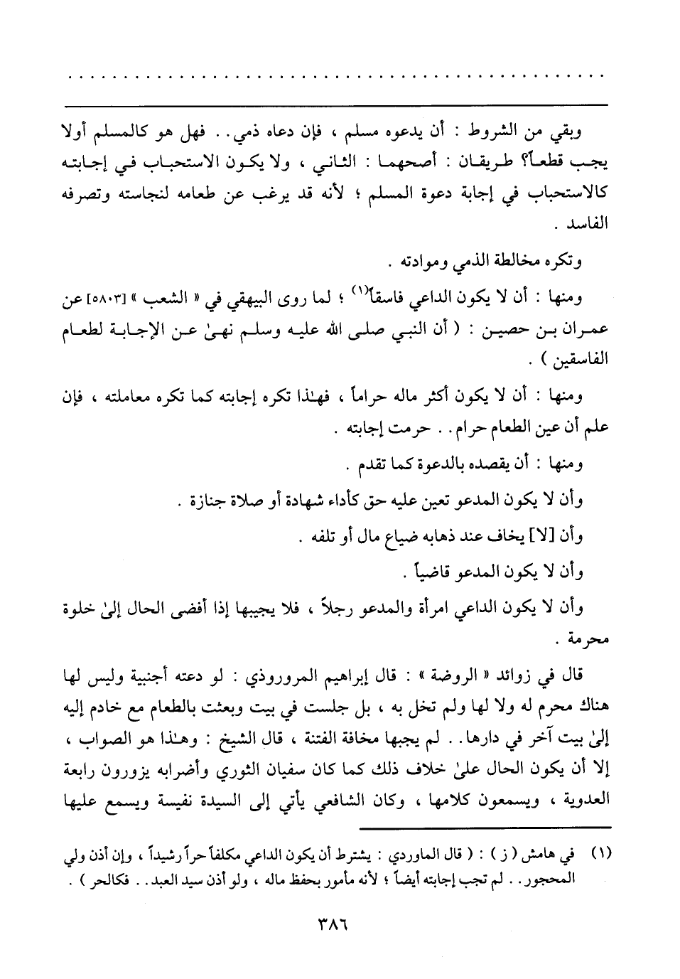 ومنها: أن لا يكون الداعي فاسقًا؛ لما روى البيهقي في (الشعب) [5803] عن عمران بن حصين: (أن النبي صلي الله عليه وسلم نهى عن الإجابة لطعام الفاسقين).